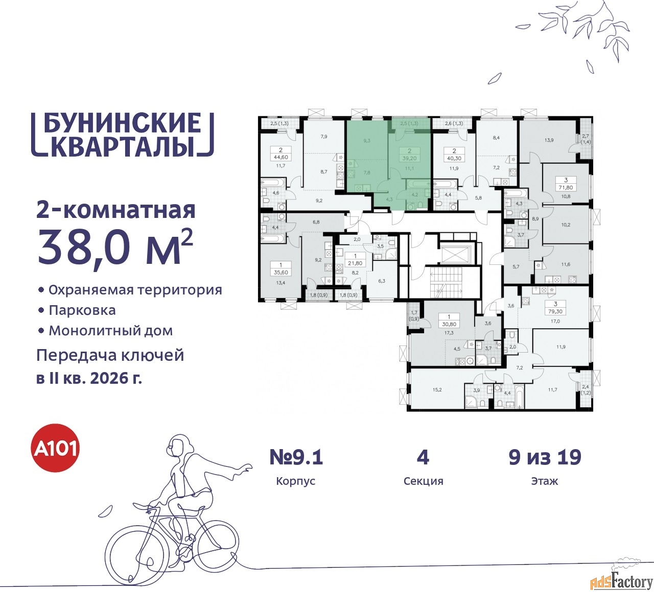 Дом монолитный, многоподъездный, переменной этажности, от 9 до 19 этажей. Квартира находится в 4-й секции высотой 9 этажей в корпусе 9.1. На этаже 8 квартир. В подъезде 1 грузовой лифт. Начало строительства - 4 квартал 2023 года. Окончание строительства - 2 квартал 2026 года. Оформление сделки по договору долевого участия.