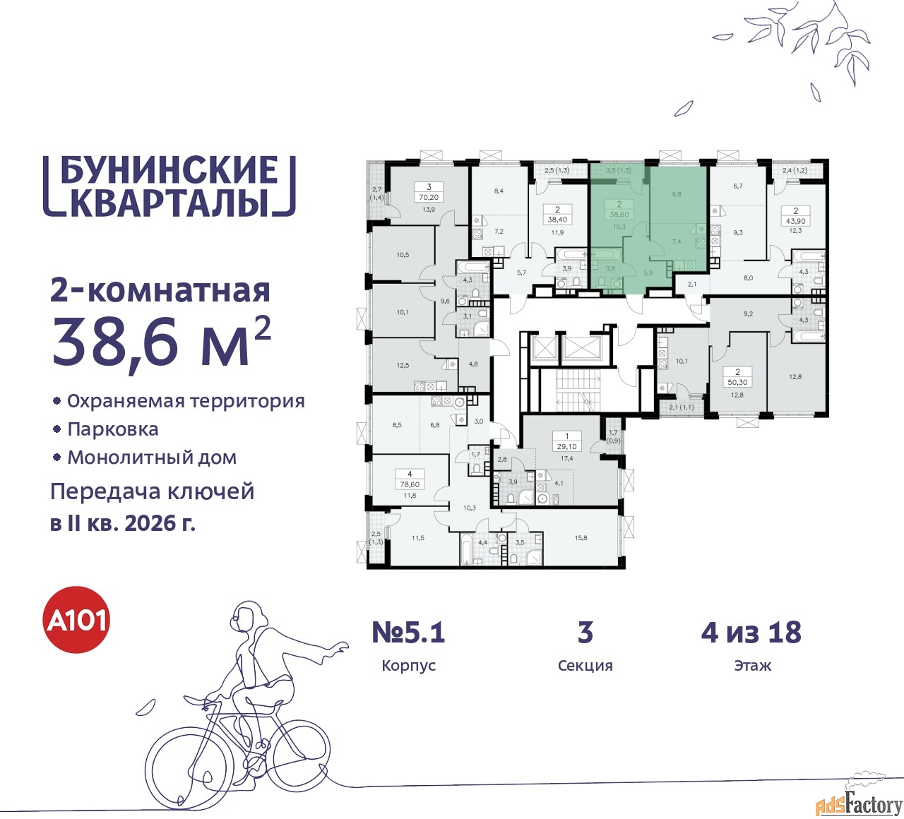 Дом монолитный, многоподъездный, переменной этажности, от 9 до 18 этажей. Квартира находится в 3-й секции высотой 18 этажей в корпусе 5.1. На этаже 7 квартир. В подъезде 1 пассажирский и 1 грузовой лифт. Начало строительства - 4 квартал 2023 года. Окончание строительства - 2 квартал 2026 года. Оформление сделки по договору долевого участия.
