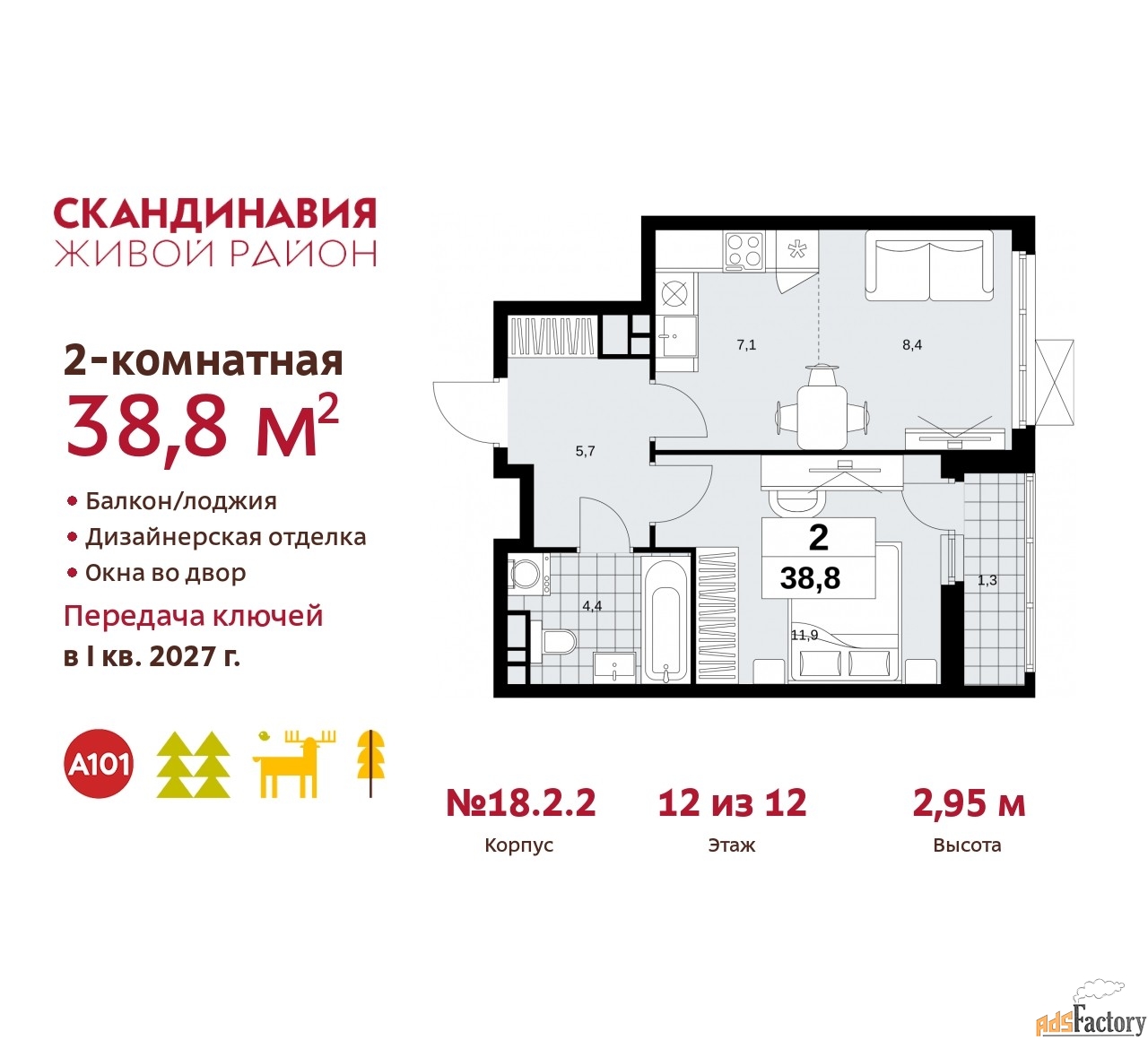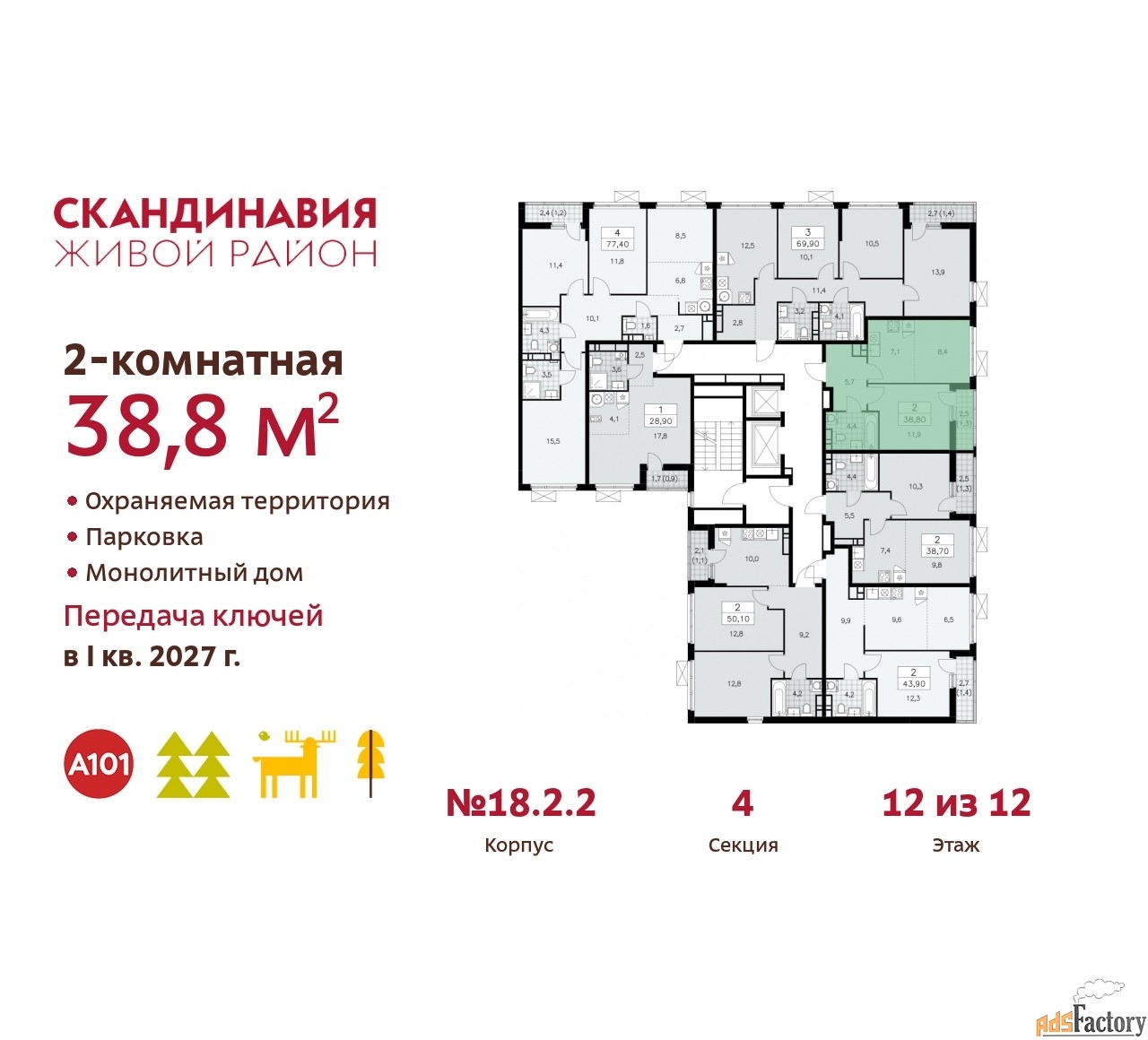 Дом монолитный, двухподъездный, высотой 12 этажей. Квартира находится во 2-й секции в корпусе 2.18.2.2. На этаже 7 квартир. В подъезде 1 пассажирский и 1 грузовой лифт. Начало строительства - 1 квартал 2024 года. Окончание строительства - 1 квартал 2027 года. Оформление сделки по договору долевого участия.