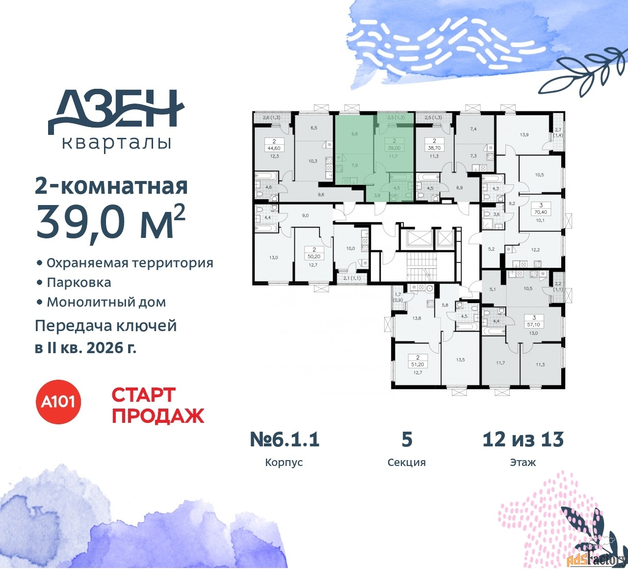 Дом монолитный, многоподъездный, переменной этажности, от 9 до 13 этажей. Квартира находится в 5-й секции высотой 13 этажей в корпусе 6.1.1. На этаже 7 квартир. В подъезде 1 пассажирский и 1 грузовой лифт. Начало строительства - 4 квартал 2023 года. Окончание строительства - 2 квартал 2026 года. Оформление сделки по договору долевого участия.
