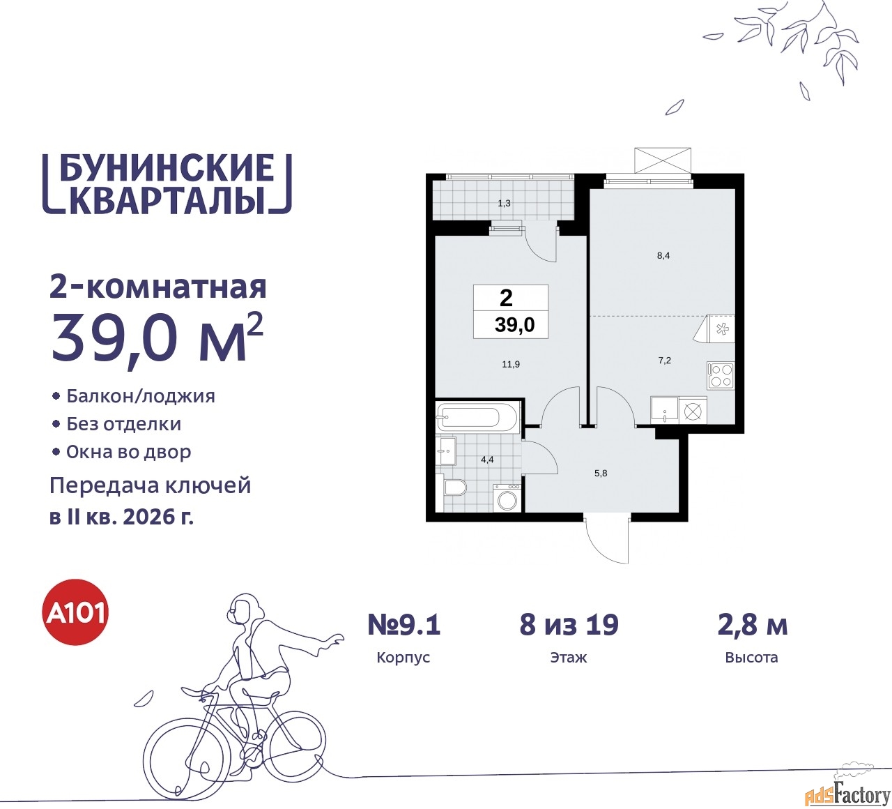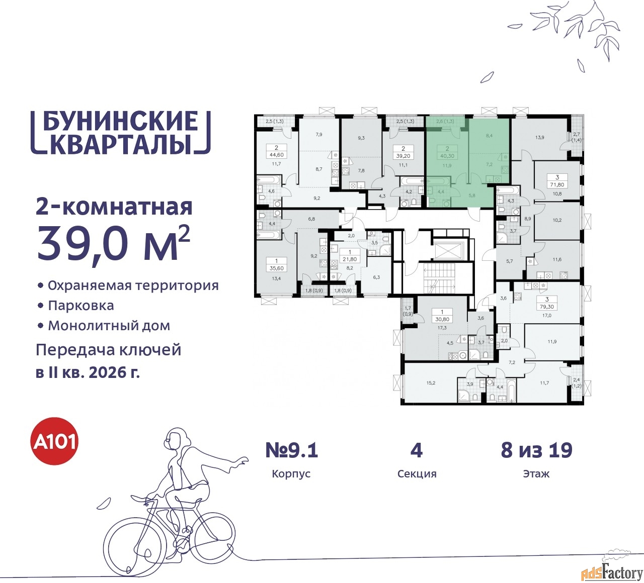Дом монолитный, многоподъездный, переменной этажности, от 9 до 19 этажей. Квартира находится в 4-й секции высотой 9 этажей в корпусе 9.1. На этаже 8 квартир. В подъезде 1 грузовой лифт. Начало строительства - 4 квартал 2023 года. Окончание строительства - 2 квартал 2026 года. Оформление сделки по договору долевого участия.