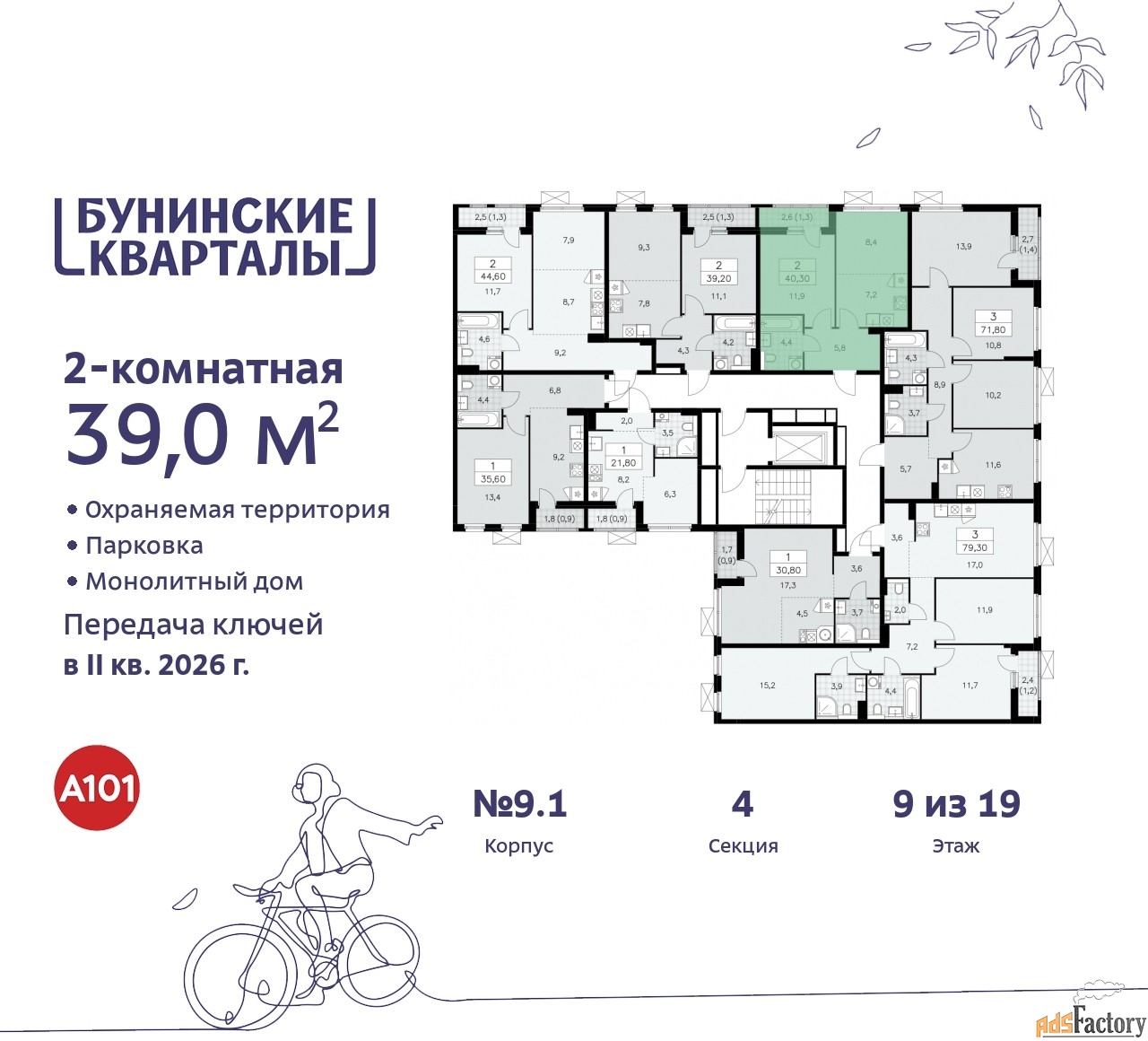 Дом монолитный, многоподъездный, переменной этажности, от 9 до 19 этажей. Квартира находится в 4-й секции высотой 9 этажей в корпусе 9.1. На этаже 8 квартир. В подъезде 1 грузовой лифт. Начало строительства - 4 квартал 2023 года. Окончание строительства - 2 квартал 2026 года. Оформление сделки по договору долевого участия.