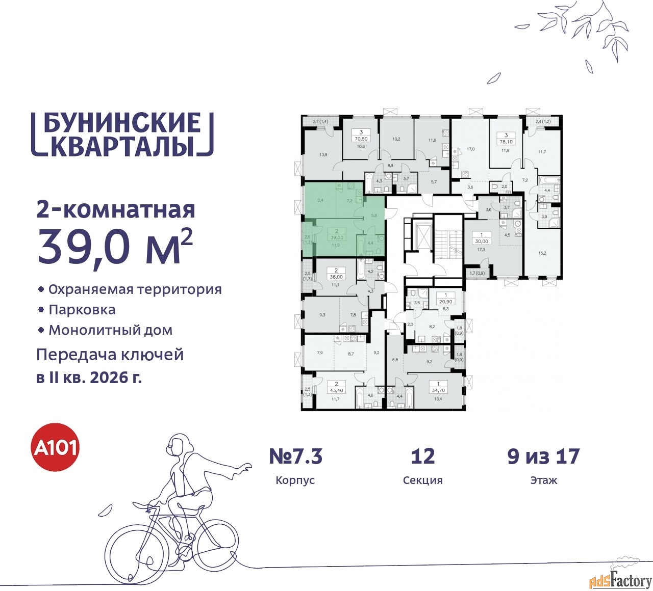 Дом монолитный, многоподъездный, переменной этажности, от 9 до 17 этажей. Квартира находится в 4-й секции высотой 9 этажей в корпусе 7.3. На этаже 8 квартир. В подъезде 1 грузовой лифт. Начало строительства - 4 квартал 2023 года. Окончание строительства - 2 квартал 2026 года. Оформление сделки по договору долевого участия.