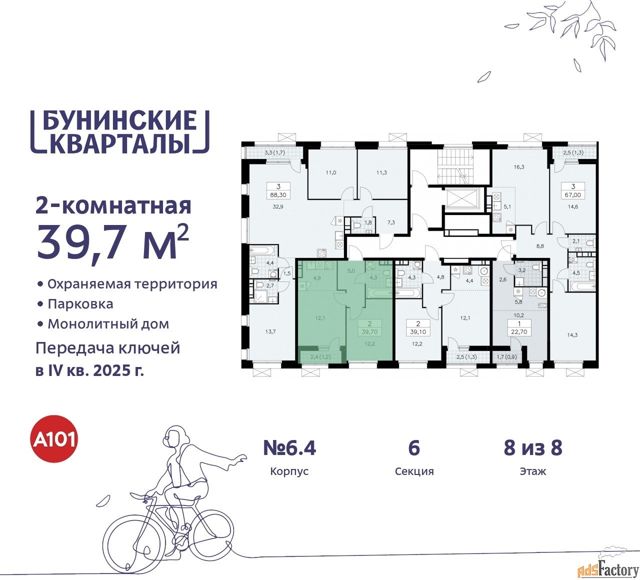Дом монолитный, двухподъездный, высотой 8 этажей. Квартира находится в 1-й секции в корпусе бизнес-класса 6.4. На этаже 5 квартир. В подъезде 1 грузовой лифт. Начало строительства - 3 квартал 2023 года. Окончание строительства - 4 квартал 2025 года. Оформление сделки по договору долевого участия.