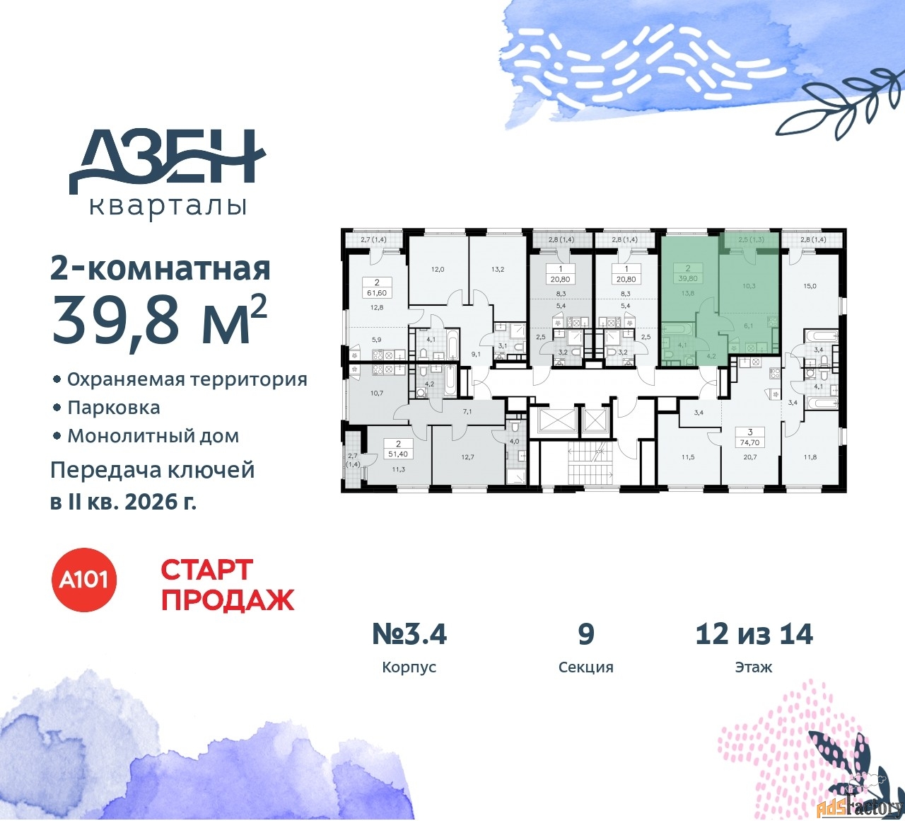 Дом монолитный, многоподъездный, переменной этажности, от 9 до 14 этажей. Квартира находится в 1-й секции высотой 14 этажей в корпусе 3.4. На этаже 6 квартир. В подъезде 1 пассажирский и 1 грузовой лифт. Начало строительства - 3 квартал 2023 года. Окончание строительства - 2 квартал 2026 года. Оформление сделки по договору долевого участия.