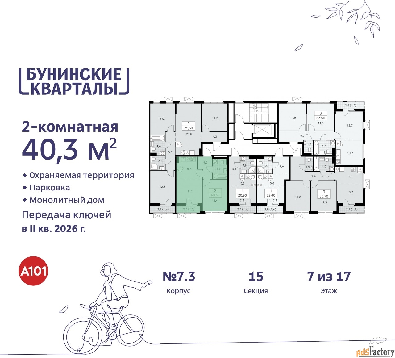 Дом монолитный, многоподъездный, переменной этажности, от 9 до 17 этажей. Квартира находится в 7-й секции высотой 9 этажей в корпусе 7.3. На этаже 6 квартир. В подъезде 1 грузовой лифт. Начало строительства - 4 квартал 2023 года. Окончание строительства - 2 квартал 2026 года. Оформление сделки по договору долевого участия.