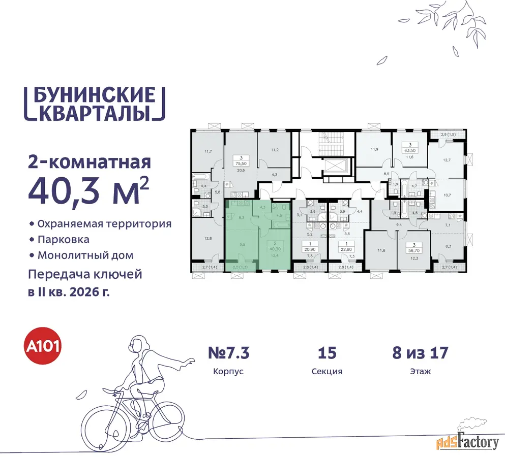 Дом монолитный, многоподъездный, переменной этажности, от 9 до 17 этажей. Квартира находится в 7-й секции высотой 9 этажей в корпусе 7.3. На этаже 6 квартир. В подъезде 1 грузовой лифт. Начало строительства - 4 квартал 2023 года. Окончание строительства - 2 квартал 2026 года. Оформление сделки по договору долевого участия.
