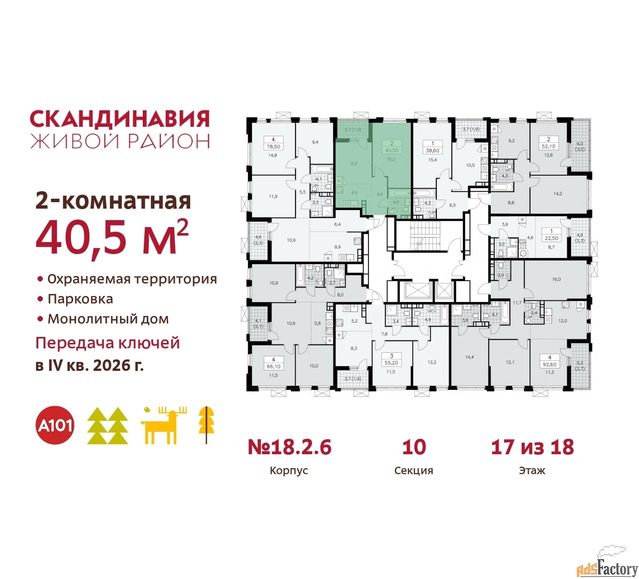 Квартира находится в корпусе 2.18.2.6. Дом монолитный, одноподъездный, высотой 18 этажей. На этаже 8 квартир. В подъезде 1 пассажирский и 1 грузовой лифт. Начало строительства - 1 квартал 2024 года. Окончание строительства - 4 квартал 2026 года. Оформление сделки по договору долевого участия.