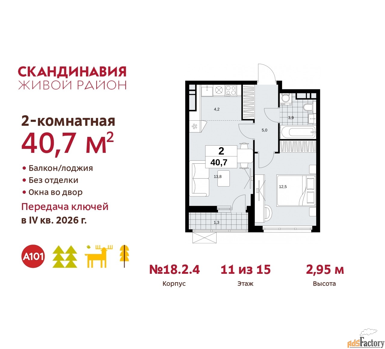 Дом монолитный, двухподъездный, переменной этажности, от 9 до 15 этажей. Квартира находится во 2-й секции высотой 15 этажей в корпусе 2.18.2.4. На этаже 5 квартир. В подъезде 1 пассажирский и 1 грузовой лифт. Начало строительства - 1 квартал 2024 года. Окончание строительства - 4 квартал 2026 года. Оформление сделки по договору долевого участия.