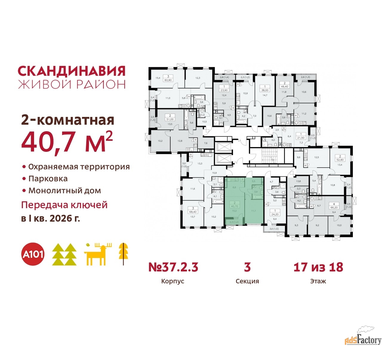 Квартира находится в корпусе 37.2.3. Дом монолитный, одноподъездный, высотой 18 этажей. На этаже 11 квартир. В подъезде 2 грузовых лифта. Начало строительства - 3 квартал 2023 года. Окончание строительства - 1 квартал 2026 года. Оформление сделки по договору долевого участия.
