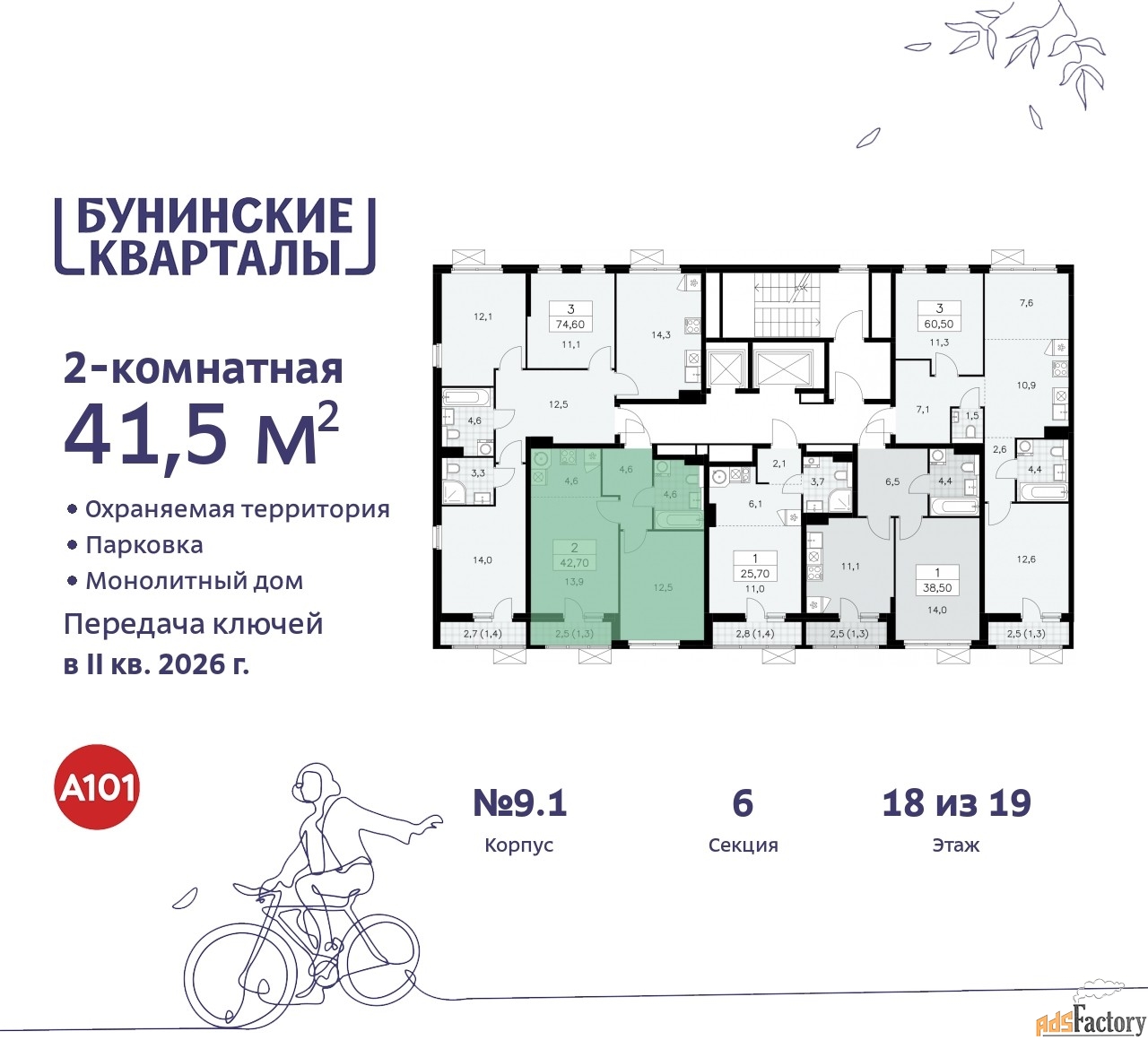 Дом монолитный, многоподъездный, переменной этажности, от 9 до 19 этажей. Квартира находится в 6-й секции высотой 19 этажей в корпусе 9.1. На этаже 5 квартир. В подъезде 1 пассажирский и 1 грузовой лифт. Начало строительства - 4 квартал 2023 года. Окончание строительства - 2 квартал 2026 года. Оформление сделки по договору долевого участия.