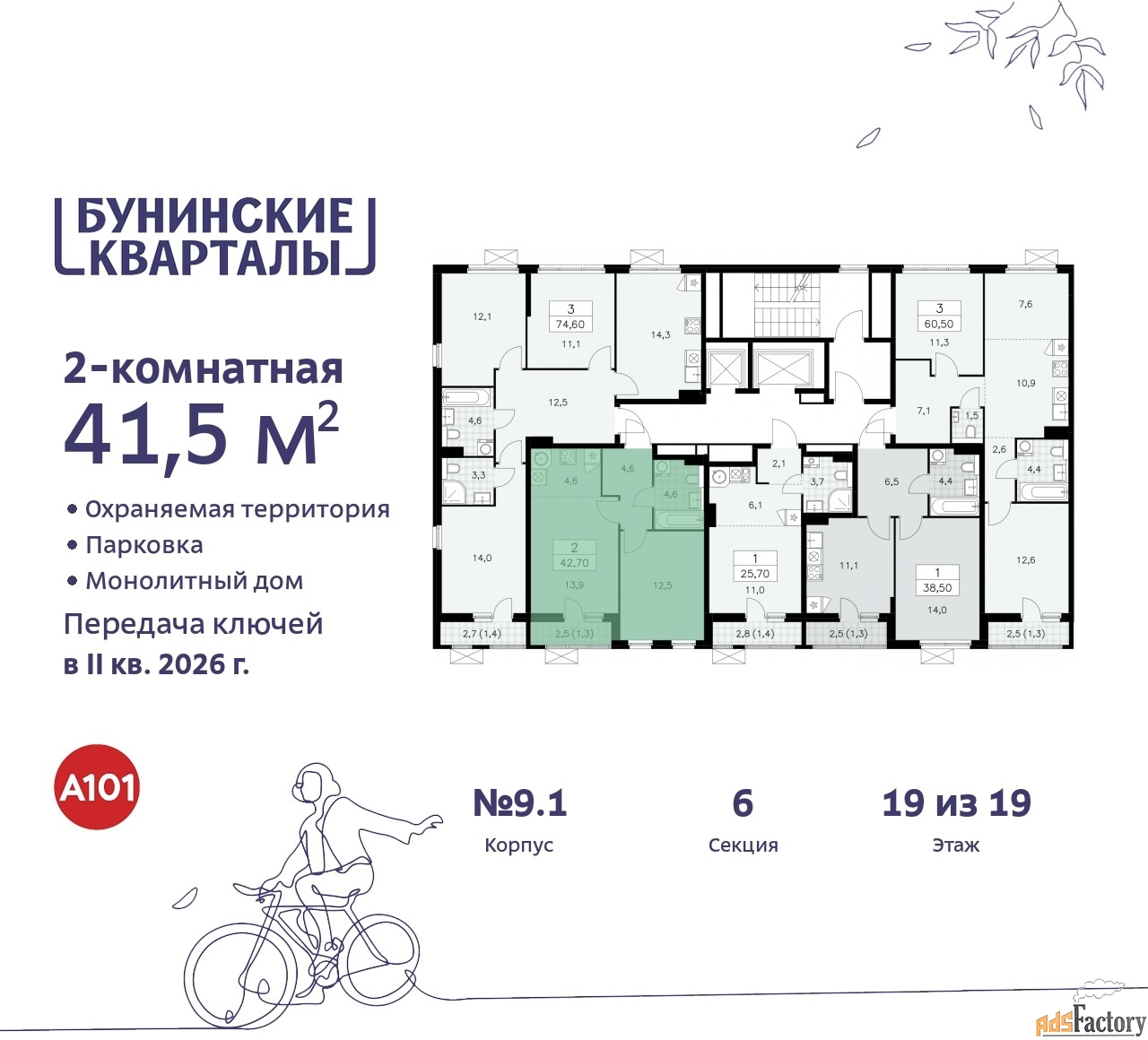 Дом монолитный, многоподъездный, переменной этажности, от 9 до 19 этажей. Квартира находится в 6-й секции высотой 19 этажей в корпусе 9.1. На этаже 5 квартир. В подъезде 1 пассажирский и 1 грузовой лифт. Начало строительства - 4 квартал 2023 года. Окончание строительства - 2 квартал 2026 года. Оформление сделки по договору долевого участия.