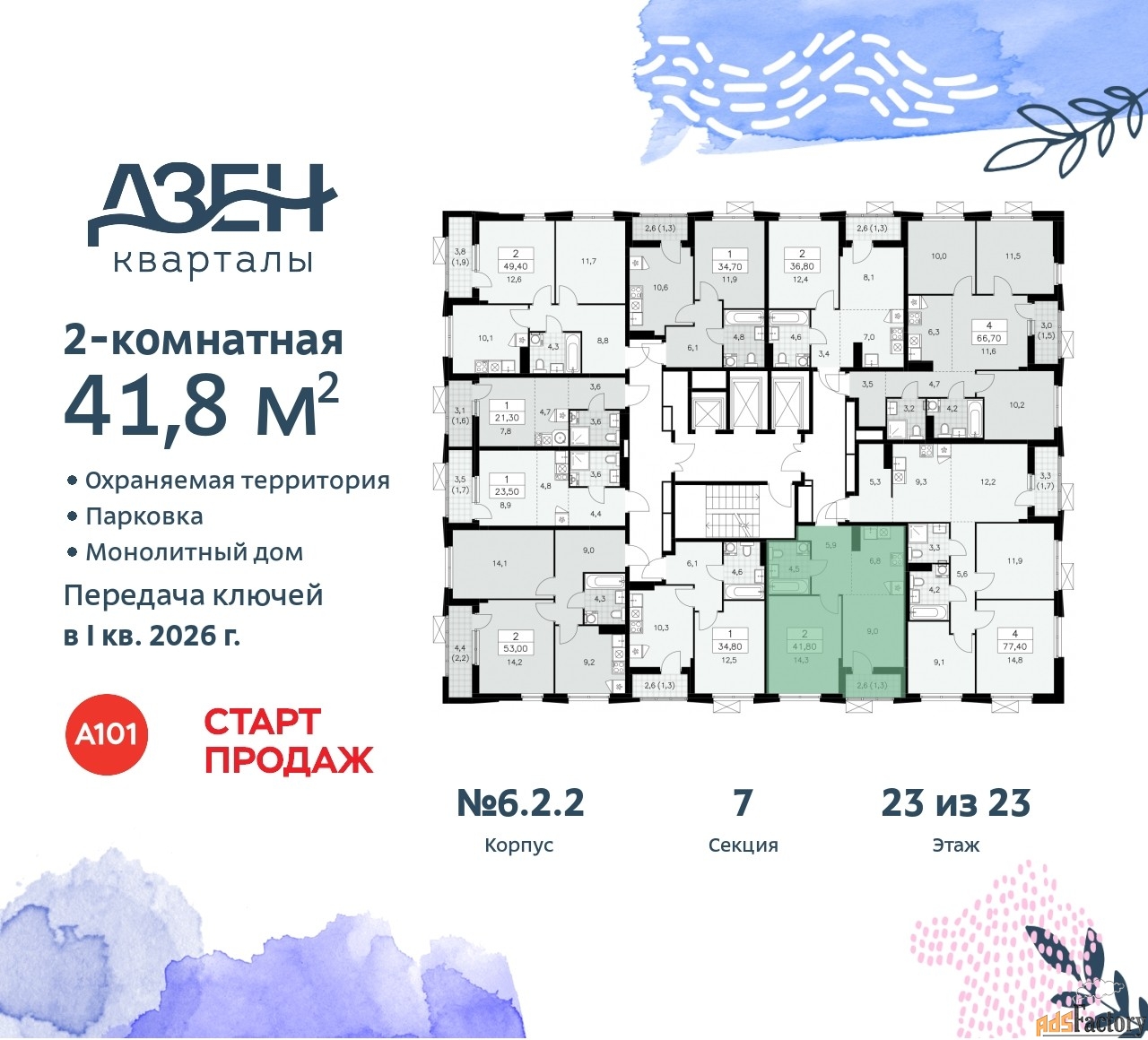 Квартира находится в корпусе 6.2.2. Дом монолитный, одноподъездный, высотой 23 этажа. На этаже 10 квартир. В подъезде 1 пассажирский и 2 грузовых лифта. Начало строительства - 4 квартал 2023 года. Окончание строительства - 1 квартал 2026 года. Оформление сделки по договору долевого участия.