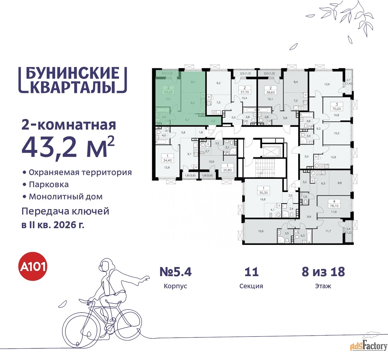 Дом монолитный, черырехподъездный, переменной этажности, от 9 до 18 этажей. Квартира находится во 2-й секции высотой 9 этажей в корпусе 5.4. На этаже 8 квартир. В подъезде 1 грузовой лифт. Начало строительства - 4 квартал 2023 года. Окончание строительства - 2 квартал 2026 года. Оформление сделки по договору долевого участия.