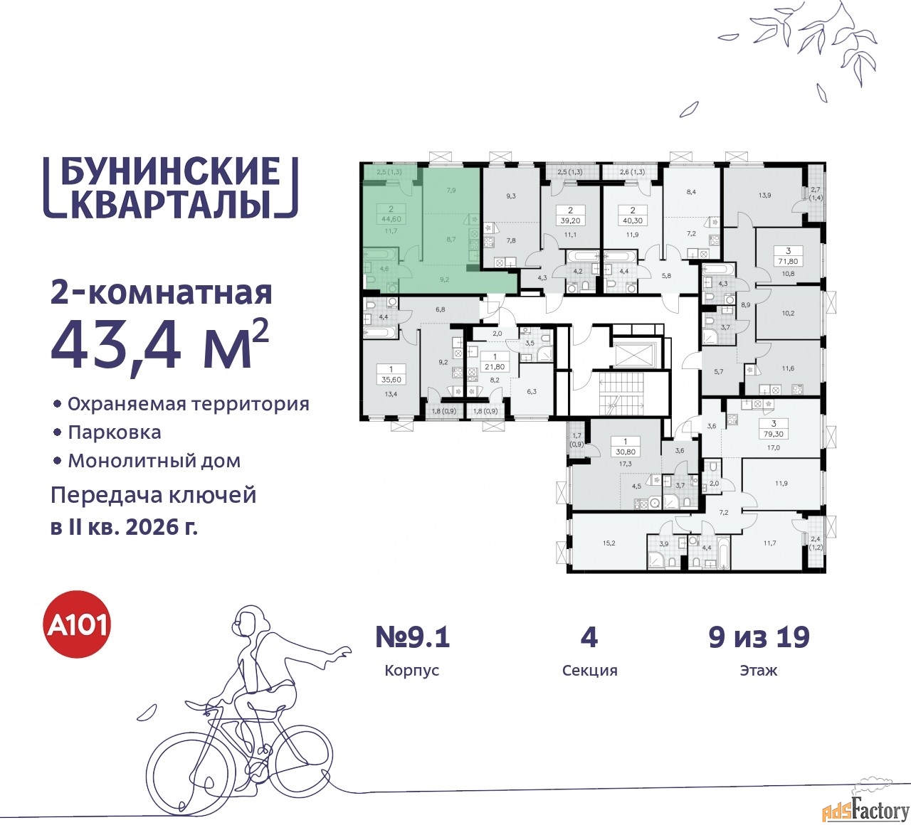 Дом монолитный, многоподъездный, переменной этажности, от 9 до 19 этажей. Квартира находится в 4-й секции высотой 9 этажей в корпусе 9.1. На этаже 8 квартир. В подъезде 1 грузовой лифт. Начало строительства - 4 квартал 2023 года. Окончание строительства - 2 квартал 2026 года. Оформление сделки по договору долевого участия.