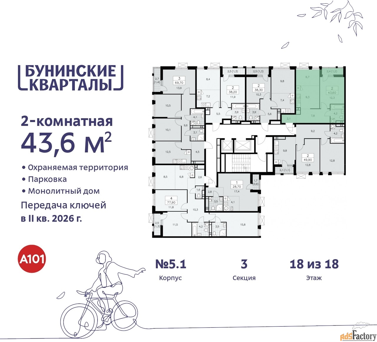 Дом монолитный, многоподъездный, переменной этажности, от 9 до 18 этажей. Квартира находится в 3-й секции высотой 18 этажей в корпусе 5.1. На этаже 7 квартир. В подъезде 1 пассажирский и 1 грузовой лифт. Начало строительства - 4 квартал 2023 года. Окончание строительства - 2 квартал 2026 года. Оформление сделки по договору долевого участия.