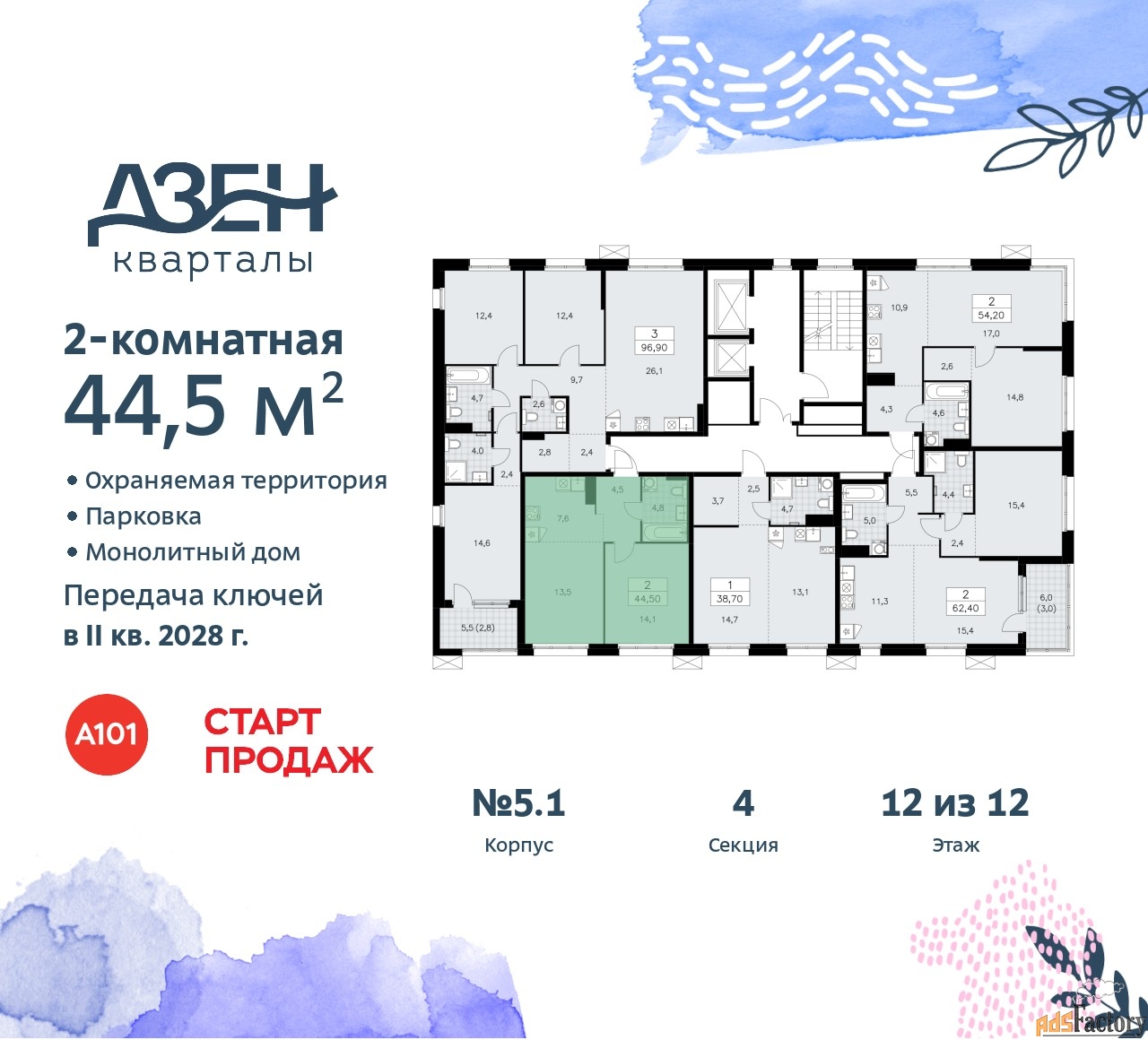 Дом монолитный, черырехподъездный, переменной этажности, от 8 до 12 этажей. Квартира находится в 4-й секции высотой 12 этажей в корпусе бизнес-класса 5.1. На этаже 5 квартир. В подъезде 1 пассажирский и 1 грузовой лифт. Начало строительства - 3 квартал 2025 года. Окончание строительства - 2 квартал 2028 года. Оформление сделки по договору долевого участия.