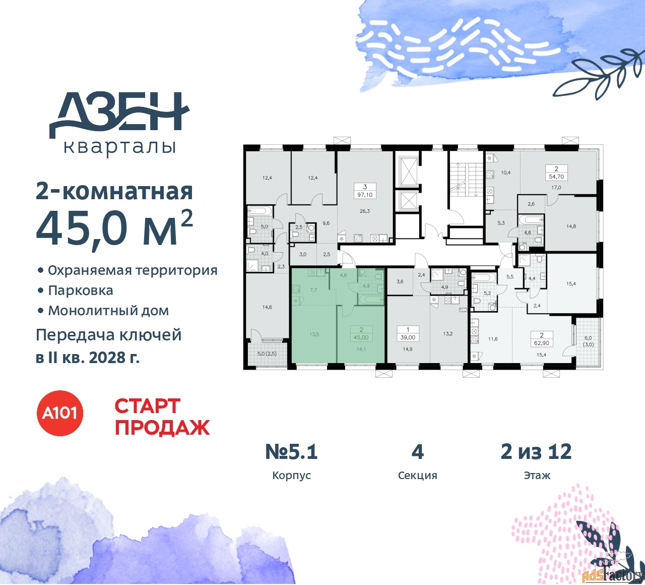 Дом монолитный, черырехподъездный, переменной этажности, от 8 до 12 этажей. Квартира находится в 4-й секции высотой 12 этажей в корпусе бизнес-класса 5.1. На этаже 5 квартир. В подъезде 1 пассажирский и 1 грузовой лифт. Начало строительства - 3 квартал 2025 года. Окончание строительства - 2 квартал 2028 года. Оформление сделки по договору долевого участия.