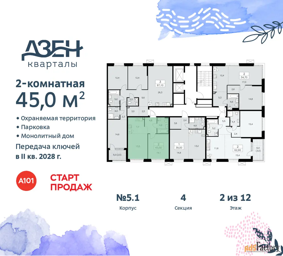 Дом монолитный, черырехподъездный, переменной этажности, от 8 до 12 этажей. Квартира находится в 4-й секции высотой 12 этажей в корпусе бизнес-класса 5.1. На этаже 5 квартир. В подъезде 1 пассажирский и 1 грузовой лифт. Начало строительства - 3 квартал 2025 года. Окончание строительства - 2 квартал 2028 года. Оформление сделки по договору долевого участия.