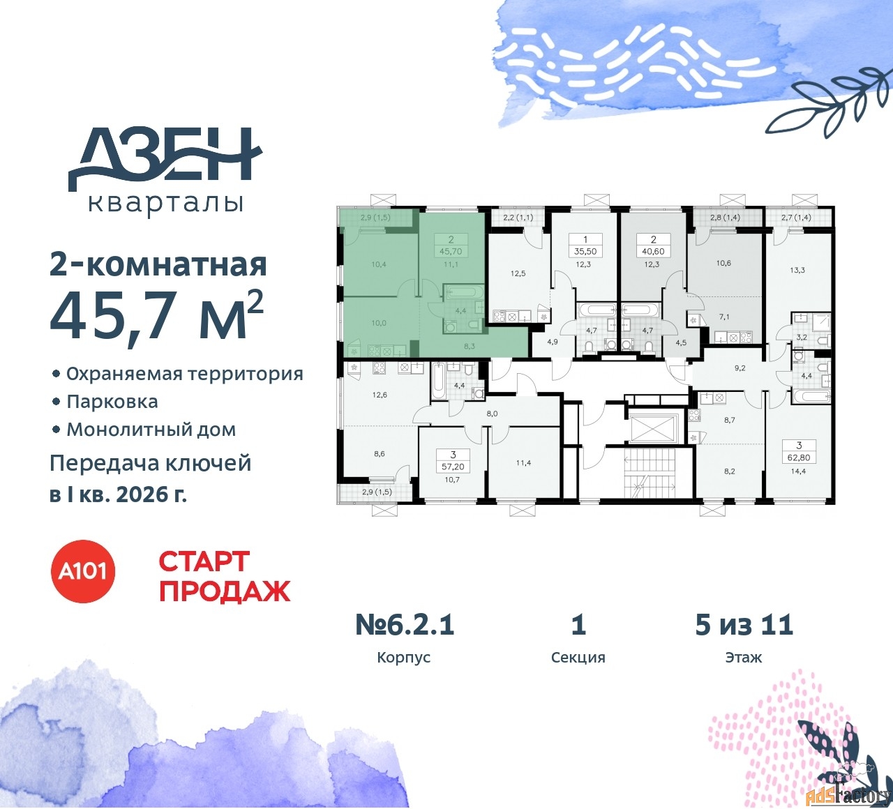 Дом монолитный, многоподъездный, переменной этажности, от 8 до 11 этажей. Квартира находится в 1-й секции высотой 8 этажей в корпусе 6.2.1. На этаже 5 квартир. В подъезде 1 грузовой лифт. Начало строительства - 4 квартал 2023 года. Окончание строительства - 1 квартал 2026 года. Оформление сделки по договору долевого участия.