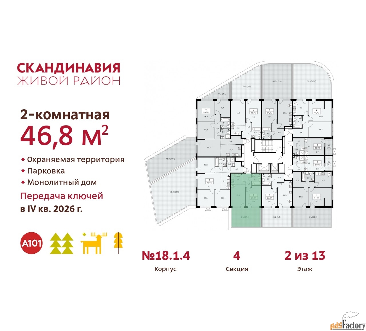 Квартира находится в корпусе 2.18.1.4. Дом монолитный, одноподъездный, высотой 13 этажей. На этаже 10 квартир. В подъезде 1 пассажирский и 1 грузовой лифт. Начало строительства - 1 квартал 2024 года. Окончание строительства - 4 квартал 2026 года. Оформление сделки по договору долевого участия.