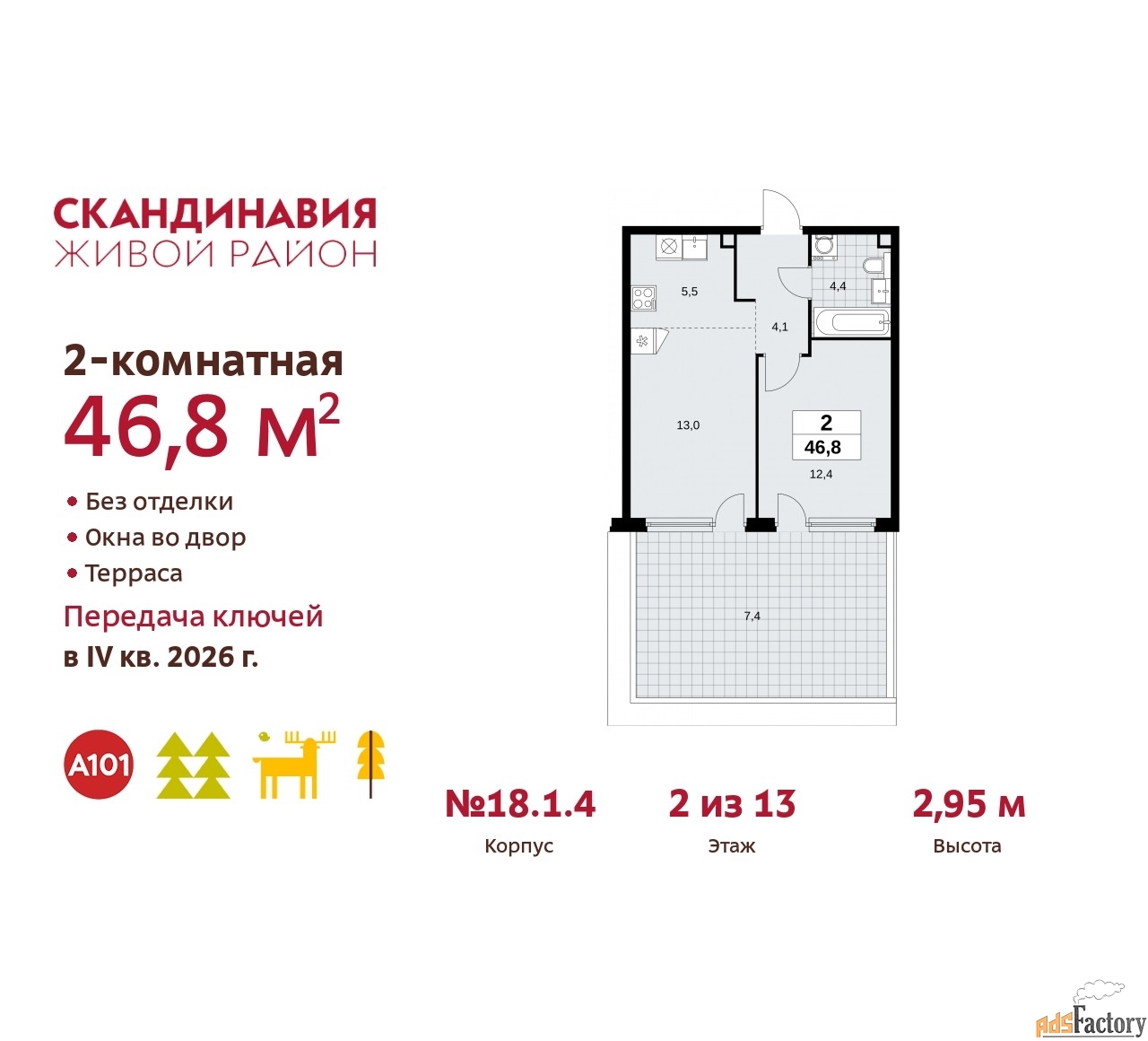 В пешей доступности находятся школы, детские сады, магазины, кафе, поликлиника, спортивная школа, отделение почты, дом культуры и пр. объекты инфраструктуры. ЖК «Скандинавия» находится в 15-минутной доступности до 3 веток метро. Автомобилисты могут воспользоваться выездом на Калужское шоссе (4,7 км). (AQID02350928)
