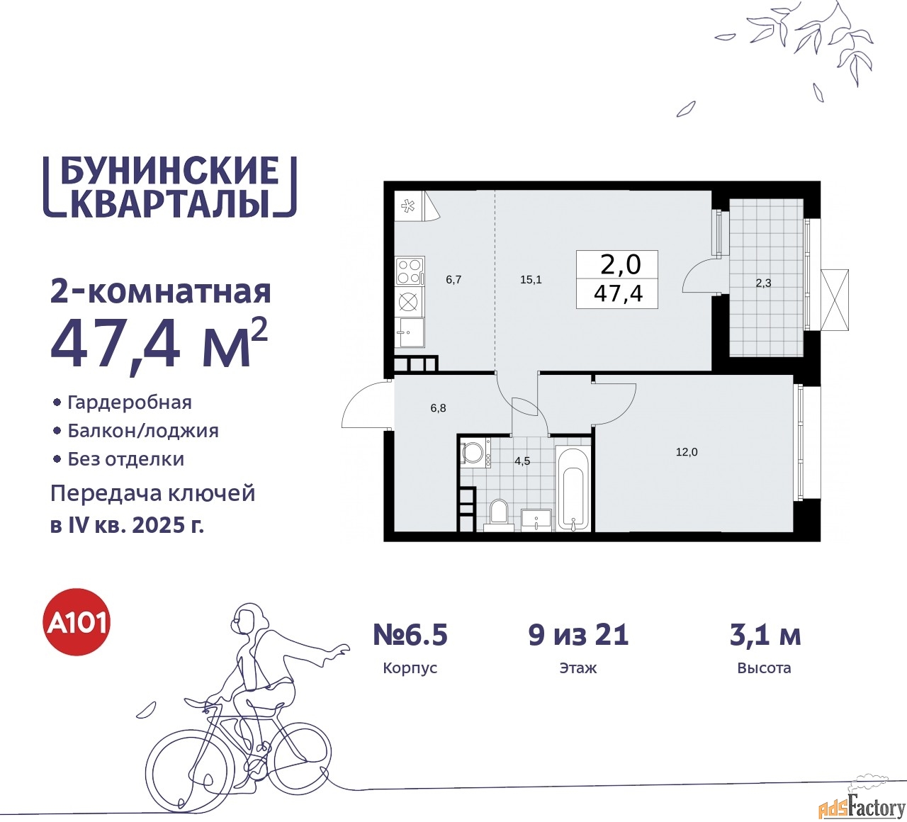 Квартира находится в корпусе 6.5. Дом монолитный, одноподъездный, высотой 21 этаж. На этаже 9 квартир. В подъезде 1 пассажирский и 2 грузовых лифта. Начало строительства - 3 квартал 2023 года. Окончание строительства - 2 квартал 2026 года. Оформление сделки по договору долевого участия.
