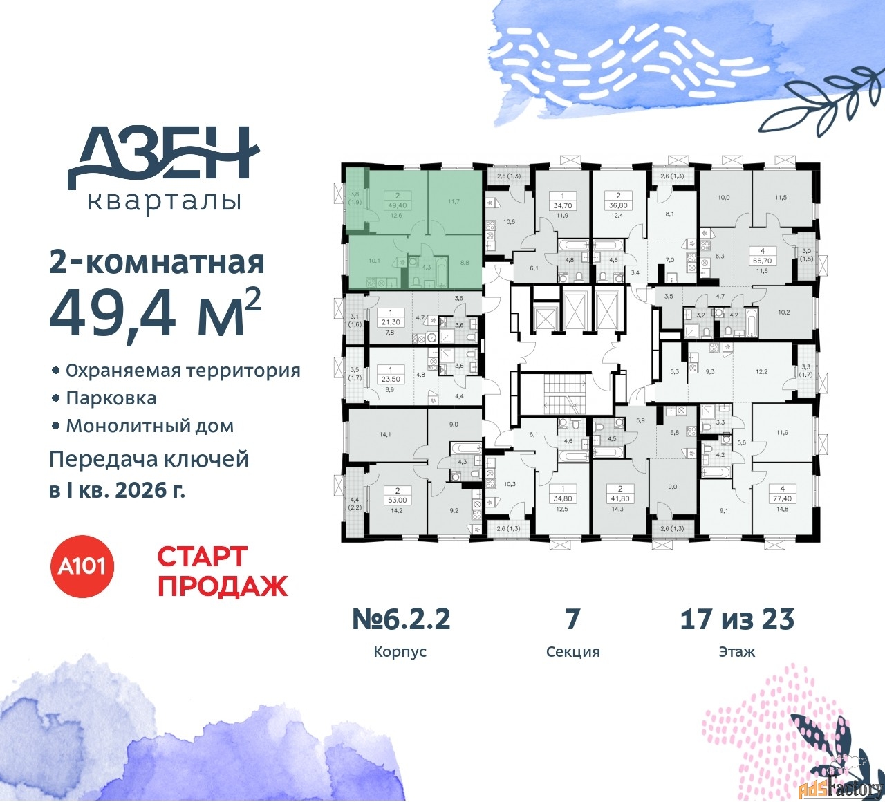 Квартира находится в корпусе 6.2.2. Дом монолитный, одноподъездный, высотой 23 этажа. На этаже 10 квартир. В подъезде 1 пассажирский и 2 грузовых лифта. Начало строительства - 4 квартал 2023 года. Окончание строительства - 1 квартал 2026 года. Оформление сделки по договору долевого участия.