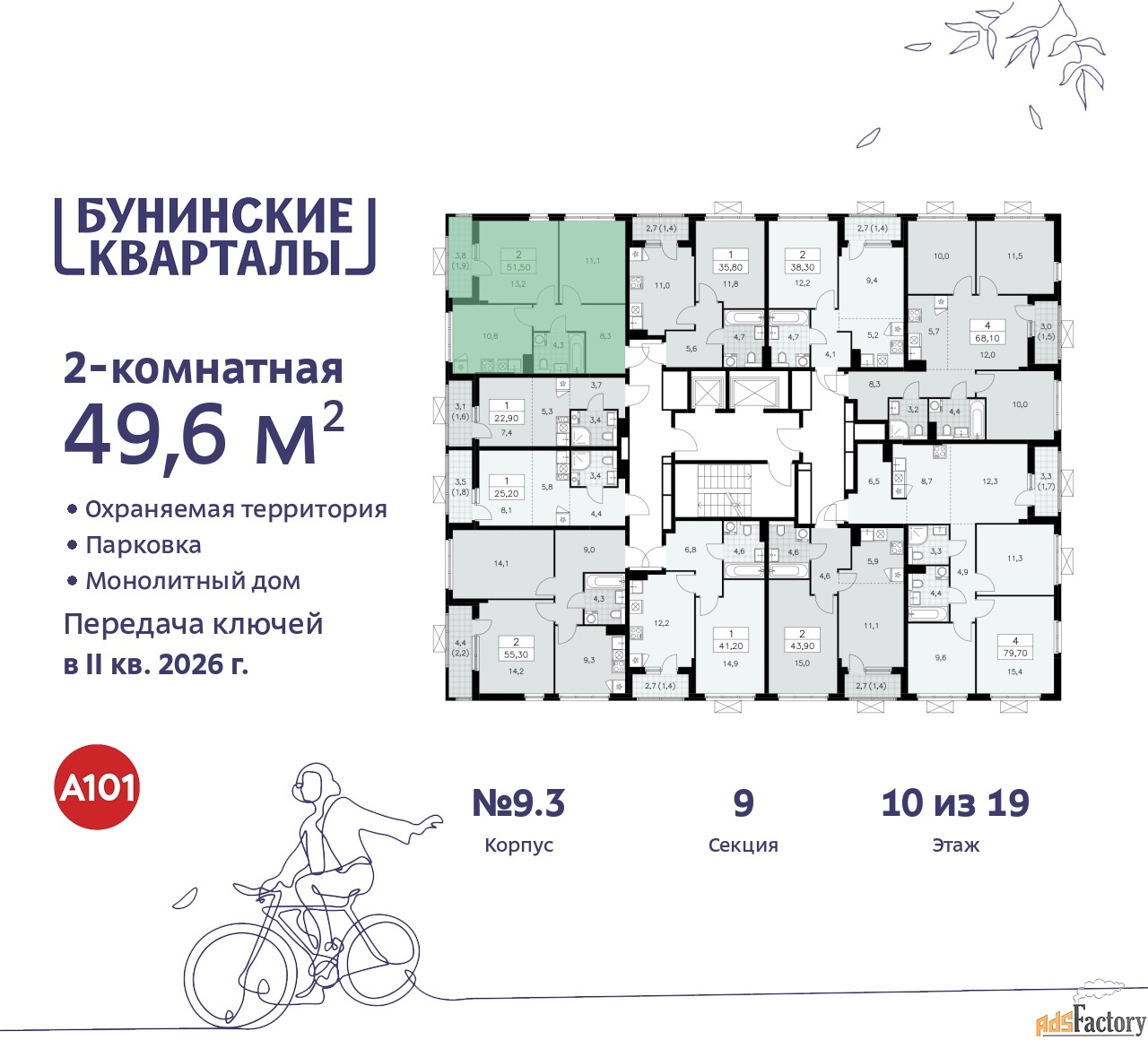 Квартира находится в корпусе 9.3. Дом монолитный, одноподъездный, высотой 19 этажей. На этаже 10 квартир. В подъезде 1 пассажирский и 1 грузовой лифт. Начало строительства - 4 квартал 2023 года. Окончание строительства - 2 квартал 2026 года. Оформление сделки по договору долевого участия.