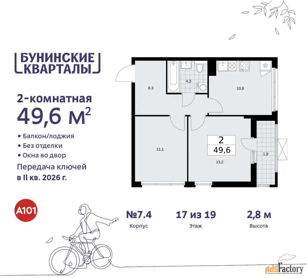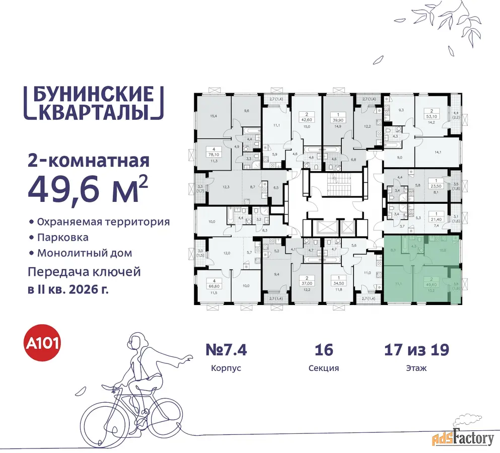 Квартира находится в корпусе 7.4. Дом монолитный, одноподъездный, высотой 19 этажей. На этаже 10 квартир. В подъезде 1 пассажирский и 1 грузовой лифт. Начало строительства - 4 квартал 2023 года. Окончание строительства - 2 квартал 2026 года. Оформление сделки по договору долевого участия.