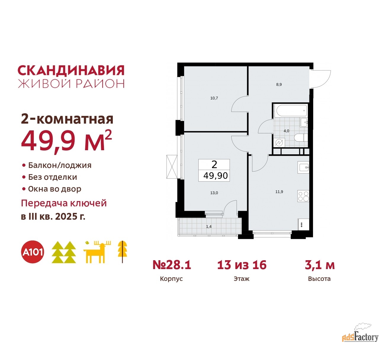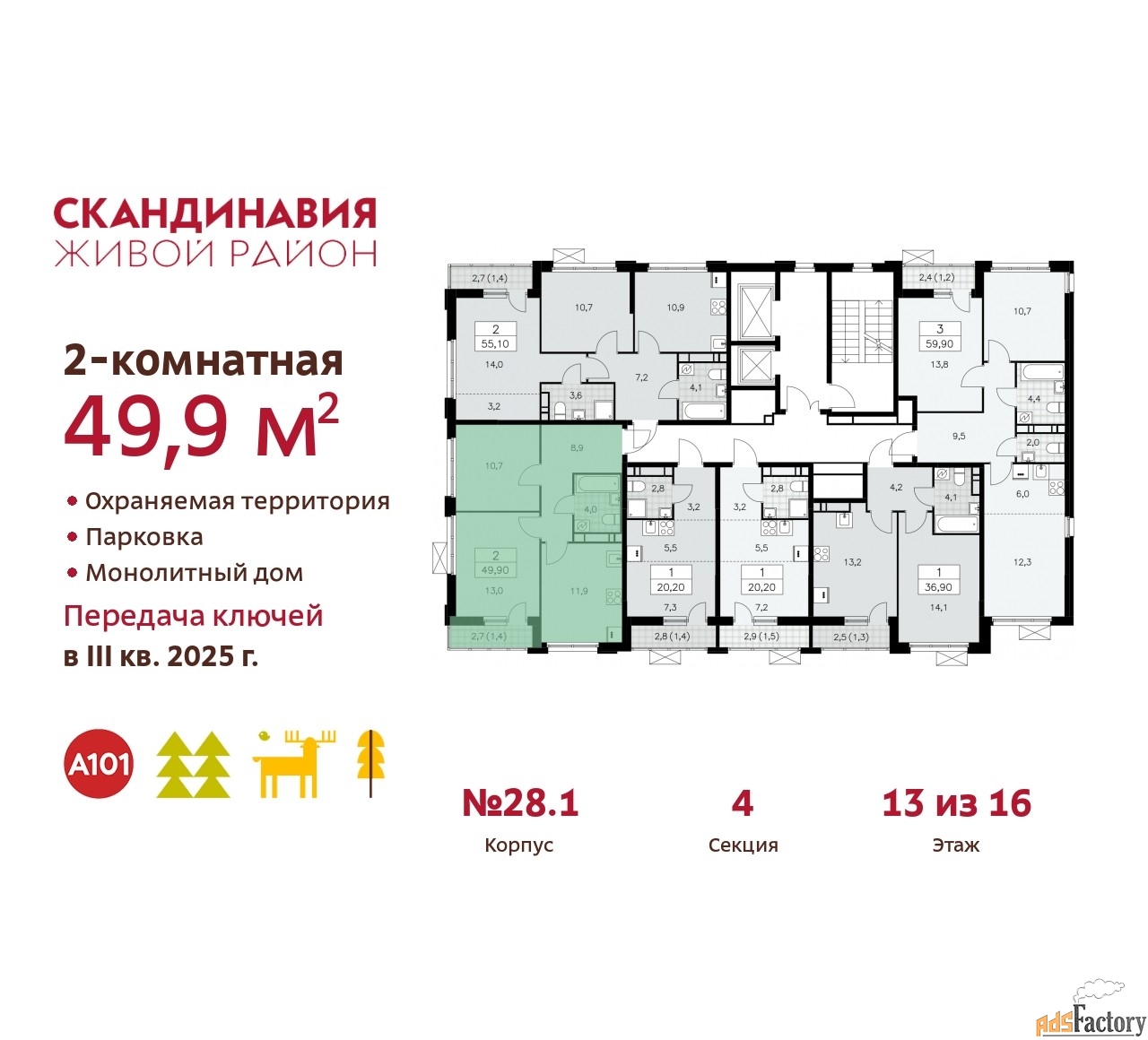 В пешей доступности находятся школы, детские сады, магазины, кафе, поликлиника, спортивная школа, отделение почты, дом культуры и пр. объекты инфраструктуры. ЖК «Скандинавия» находится в 15-минутной доступности до 3 веток метро. Автомобилисты могут воспользоваться выездом на Калужское шоссе (4,7 км). (AQID02202059)