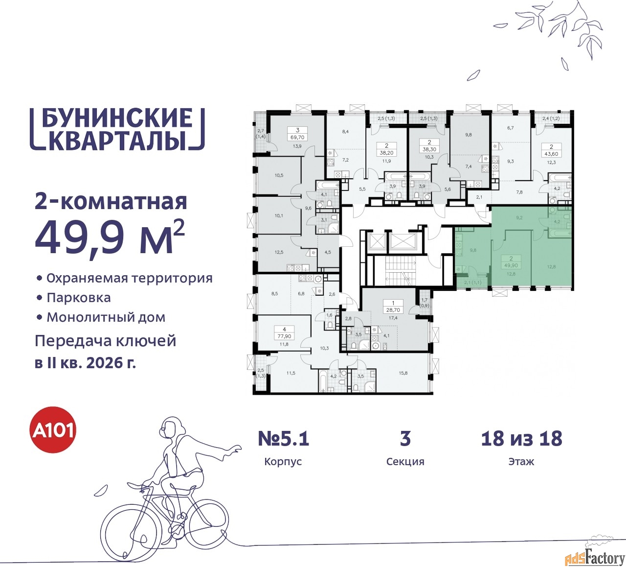 Дом монолитный, многоподъездный, переменной этажности, от 9 до 18 этажей. Квартира находится в 3-й секции высотой 18 этажей в корпусе 5.1. На этаже 7 квартир. В подъезде 1 пассажирский и 1 грузовой лифт. Начало строительства - 4 квартал 2023 года. Окончание строительства - 2 квартал 2026 года. Оформление сделки по договору долевого участия.