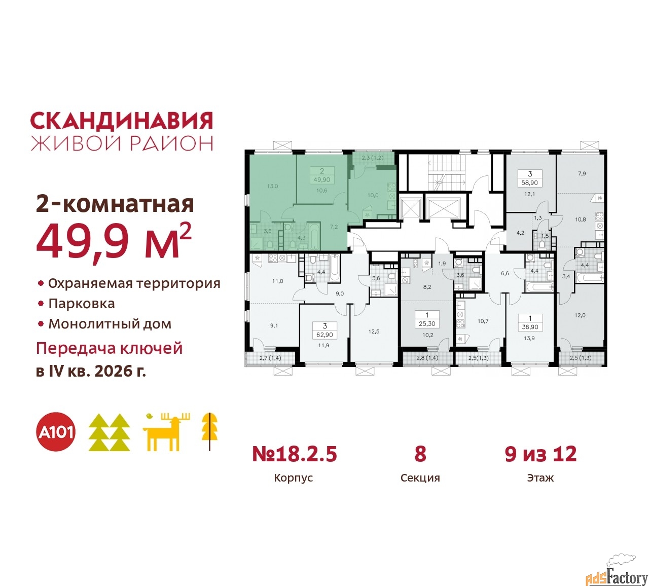Дом монолитный, двухподъездный, высотой 12 этажей. Квартира находится в 1-й секции в корпусе 2.18.2.5. На этаже 5 квартир. В подъезде 1 пассажирский и 1 грузовой лифт. Начало строительства - 1 квартал 2024 года. Окончание строительства - 4 квартал 2026 года. Оформление сделки по договору долевого участия.