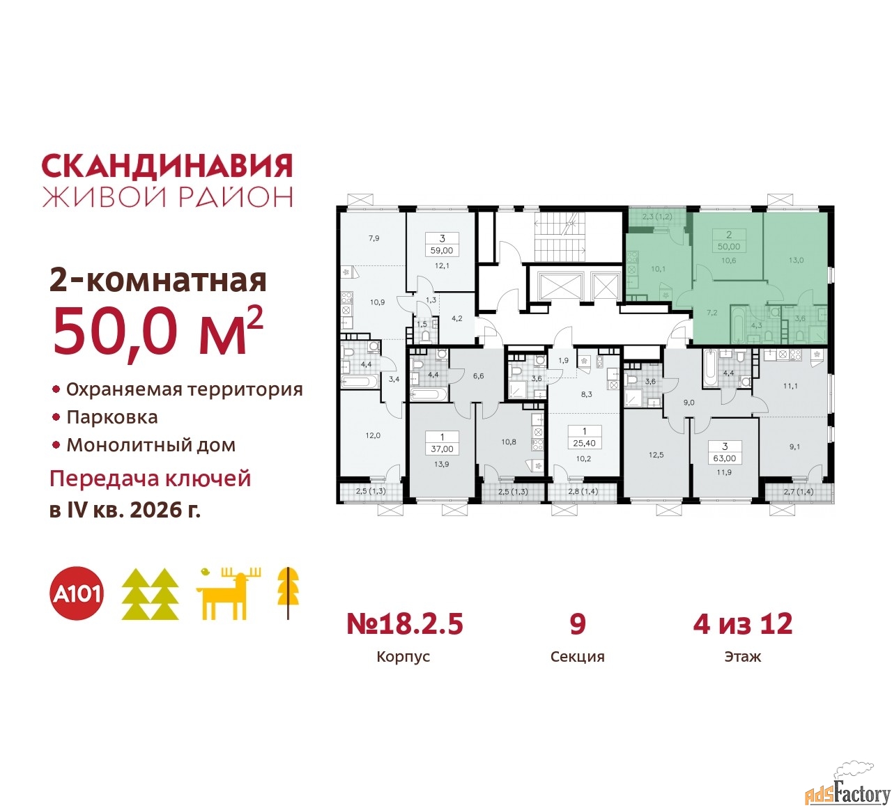 Дом монолитный, двухподъездный, высотой 12 этажей. Квартира находится во 2-й секции в корпусе 2.18.2.5. На этаже 5 квартир. В подъезде 1 пассажирский и 1 грузовой лифт. Начало строительства - 1 квартал 2024 года. Окончание строительства - 4 квартал 2026 года. Оформление сделки по договору долевого участия.