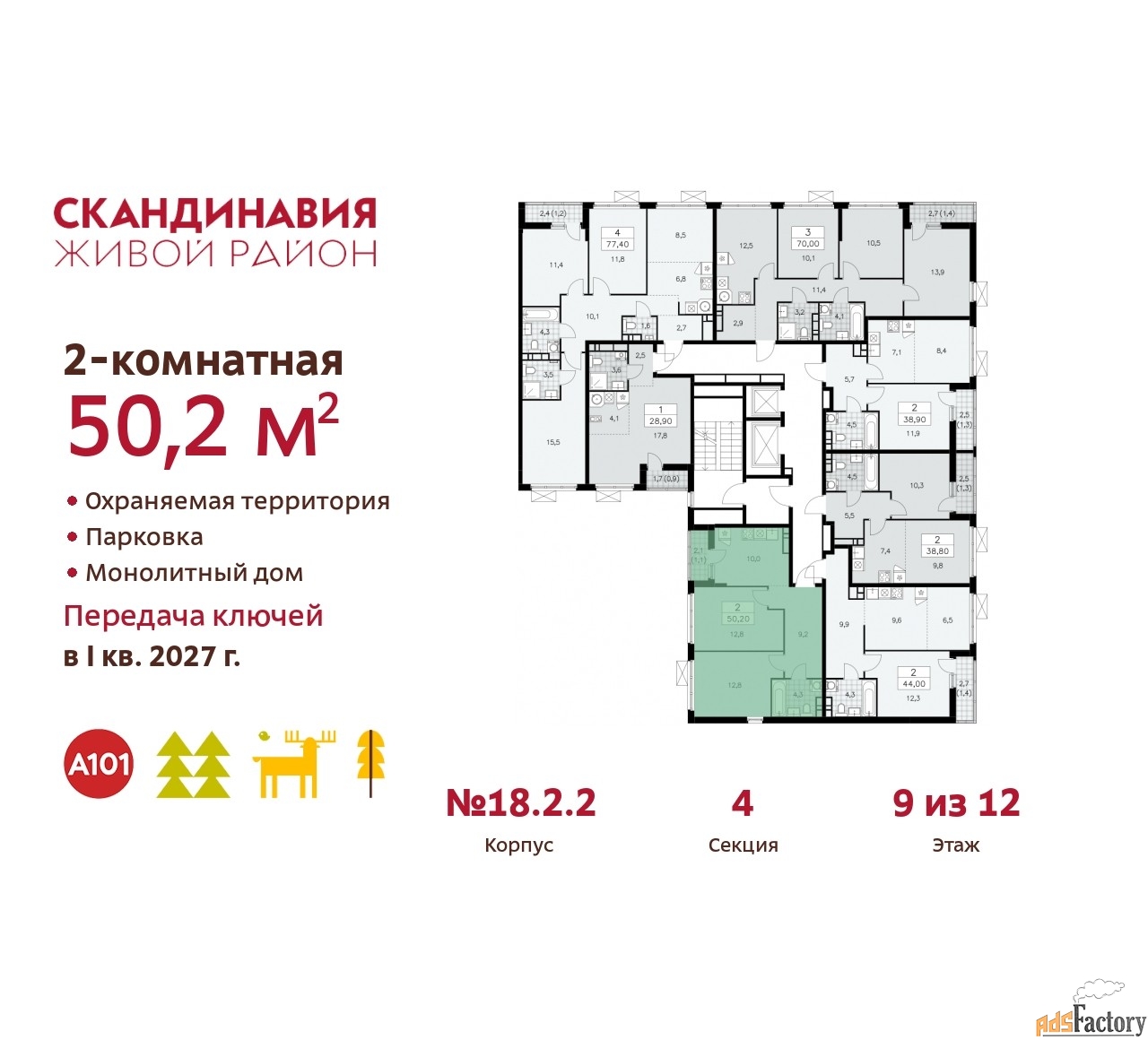 Дом монолитный, двухподъездный, высотой 12 этажей. Квартира находится во 2-й секции в корпусе 2.18.2.2. На этаже 7 квартир. В подъезде 1 пассажирский и 1 грузовой лифт. Начало строительства - 1 квартал 2024 года. Окончание строительства - 1 квартал 2027 года. Оформление сделки по договору долевого участия.