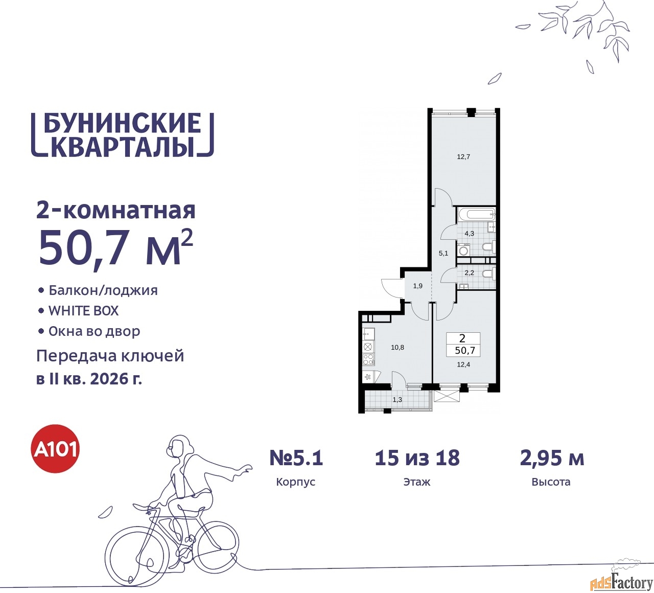 Дом монолитный, многоподъездный, переменной этажности, от 9 до 18 этажей. Квартира находится во 2-й секции высотой 18 этажей в корпусе 5.1. На этаже 5 квартир. В подъезде 1 пассажирский и 1 грузовой лифт. Начало строительства - 4 квартал 2023 года. Окончание строительства - 2 квартал 2026 года. Оформление сделки по договору долевого участия.