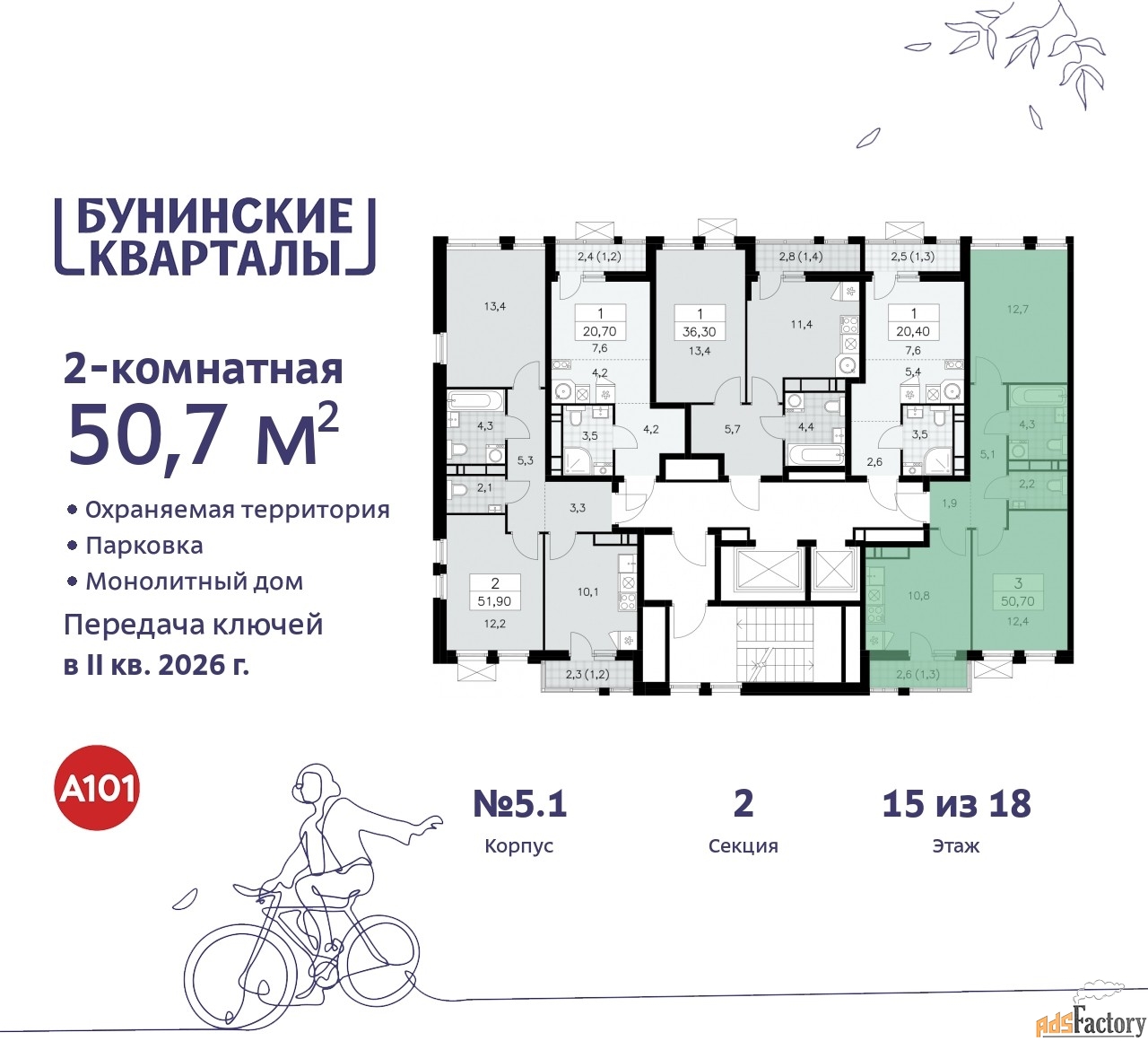 Дом монолитный, многоподъездный, переменной этажности, от 9 до 18 этажей. Квартира находится во 2-й секции высотой 18 этажей в корпусе 5.1. На этаже 5 квартир. В подъезде 1 пассажирский и 1 грузовой лифт. Начало строительства - 4 квартал 2023 года. Окончание строительства - 2 квартал 2026 года. Оформление сделки по договору долевого участия.