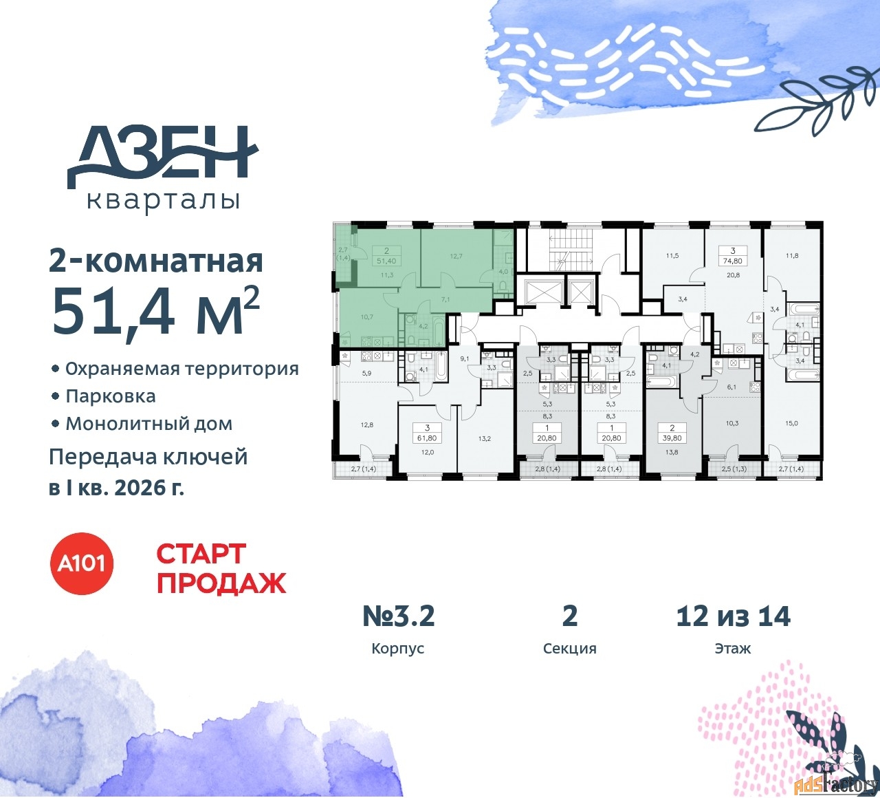 | Общая площадь (кв.м) | 51.4 |