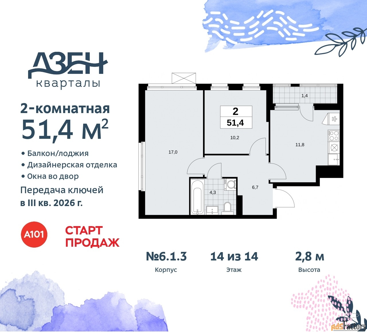| Общая площадь (кв.м) | 51.4 |