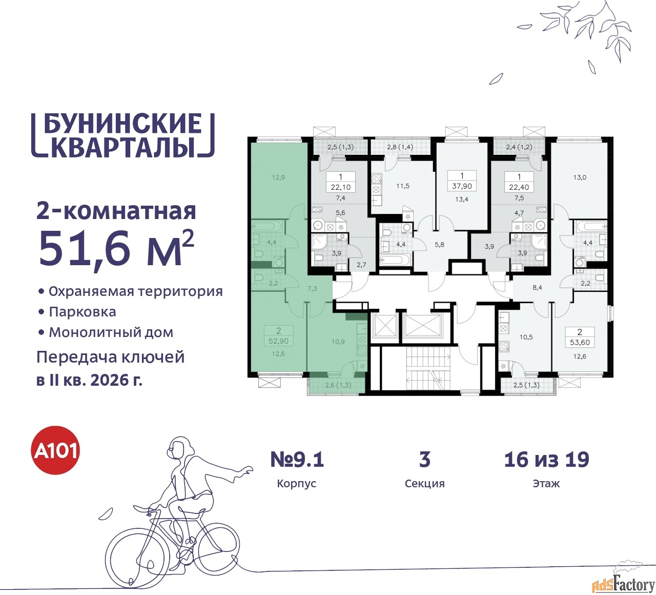 Дом монолитный, многоподъездный, переменной этажности, от 9 до 19 этажей. Квартира находится в 3-й секции высотой 17 этажей в корпусе 9.1. На этаже 5 квартир. В подъезде 1 пассажирский и 1 грузовой лифт. Начало строительства - 4 квартал 2023 года. Окончание строительства - 2 квартал 2026 года. Оформление сделки по договору долевого участия.