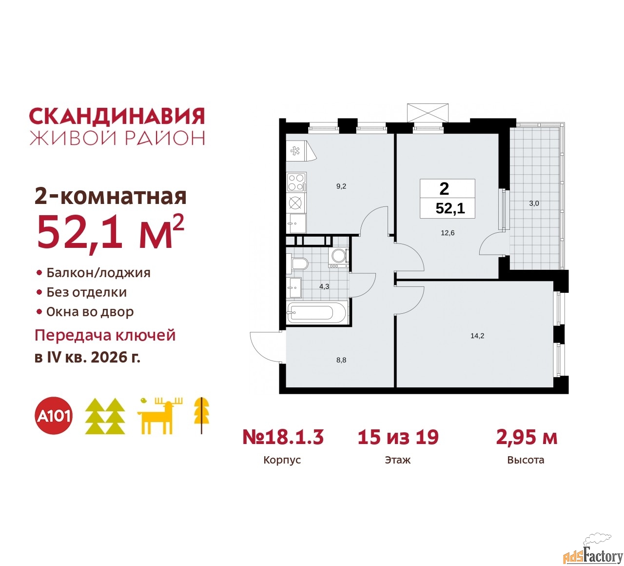 Квартира находится в корпусе 2.18.1.3. Дом монолитный, одноподъездный, высотой 19 этажей. На этаже 10 квартир. В подъезде 1 пассажирский и 1 грузовой лифт. Начало строительства - 1 квартал 2024 года. Окончание строительства - 4 квартал 2026 года. Оформление сделки по договору долевого участия.