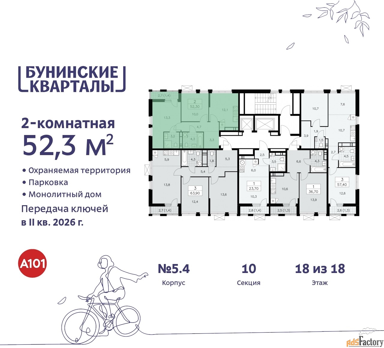 Дом монолитный, черырехподъездный, переменной этажности, от 9 до 18 этажей. Квартира находится в 1-й секции высотой 18 этажей в корпусе 5.4. На этаже 5 квартир. В подъезде 1 пассажирский и 1 грузовой лифт. Начало строительства - 4 квартал 2023 года. Окончание строительства - 2 квартал 2026 года. Оформление сделки по договору долевого участия.