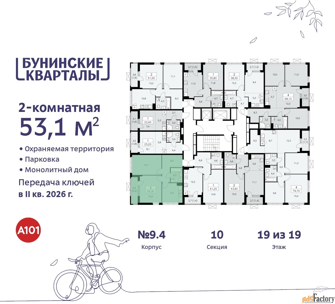 Квартира находится в корпусе 9.4. Дом монолитный, одноподъездный, высотой 19 этажей. На этаже 10 квартир. В подъезде 1 пассажирский и 1 грузовой лифт. Начало строительства - 4 квартал 2023 года. Окончание строительства - 2 квартал 2026 года. Оформление сделки по договору долевого участия.