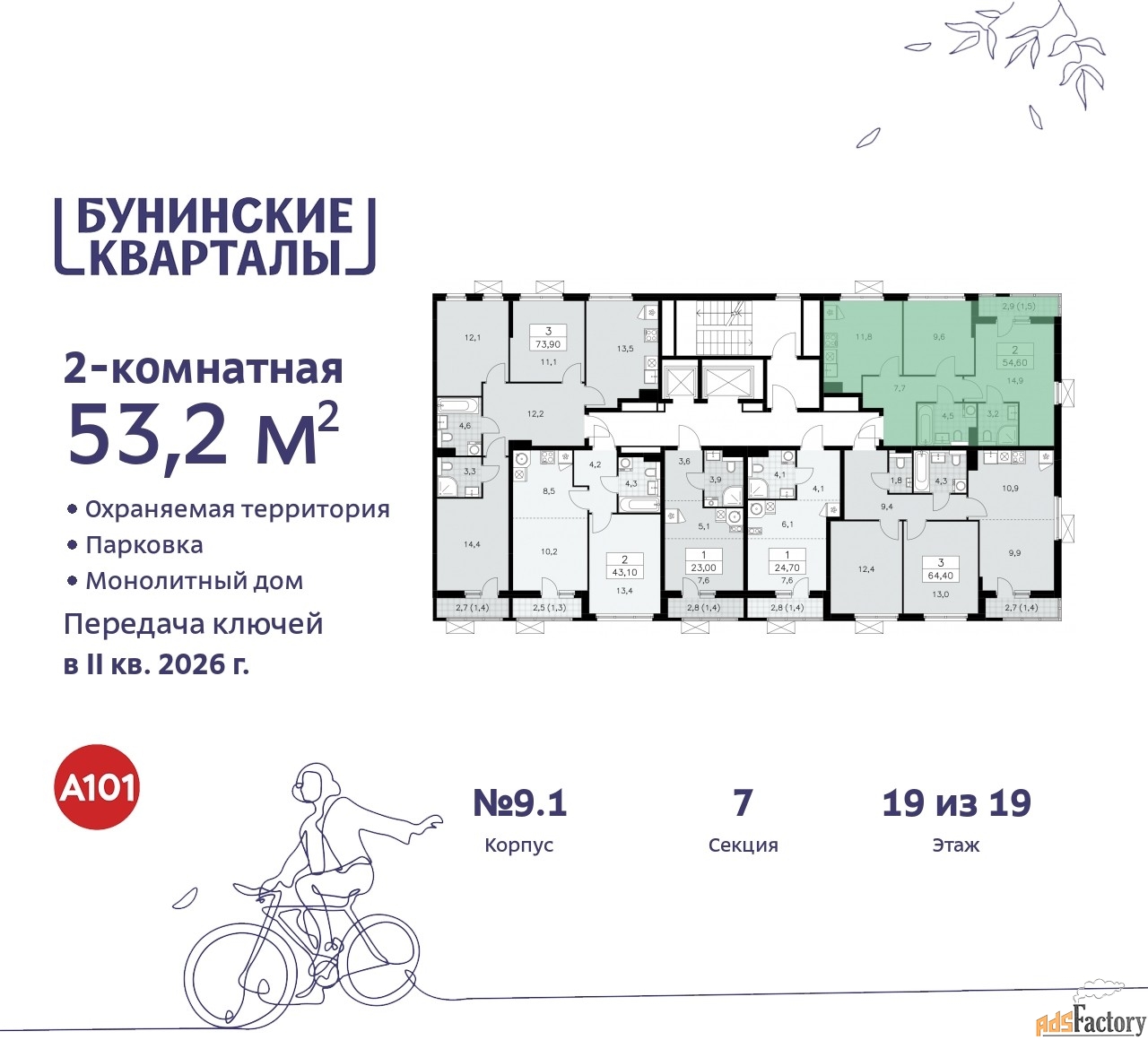Дом монолитный, многоподъездный, переменной этажности, от 9 до 19 этажей. Квартира находится в 7-й секции высотой 19 этажей в корпусе 9.1. На этаже 6 квартир. В подъезде 1 пассажирский и 1 грузовой лифт. Начало строительства - 4 квартал 2023 года. Окончание строительства - 2 квартал 2026 года. Оформление сделки по договору долевого участия.