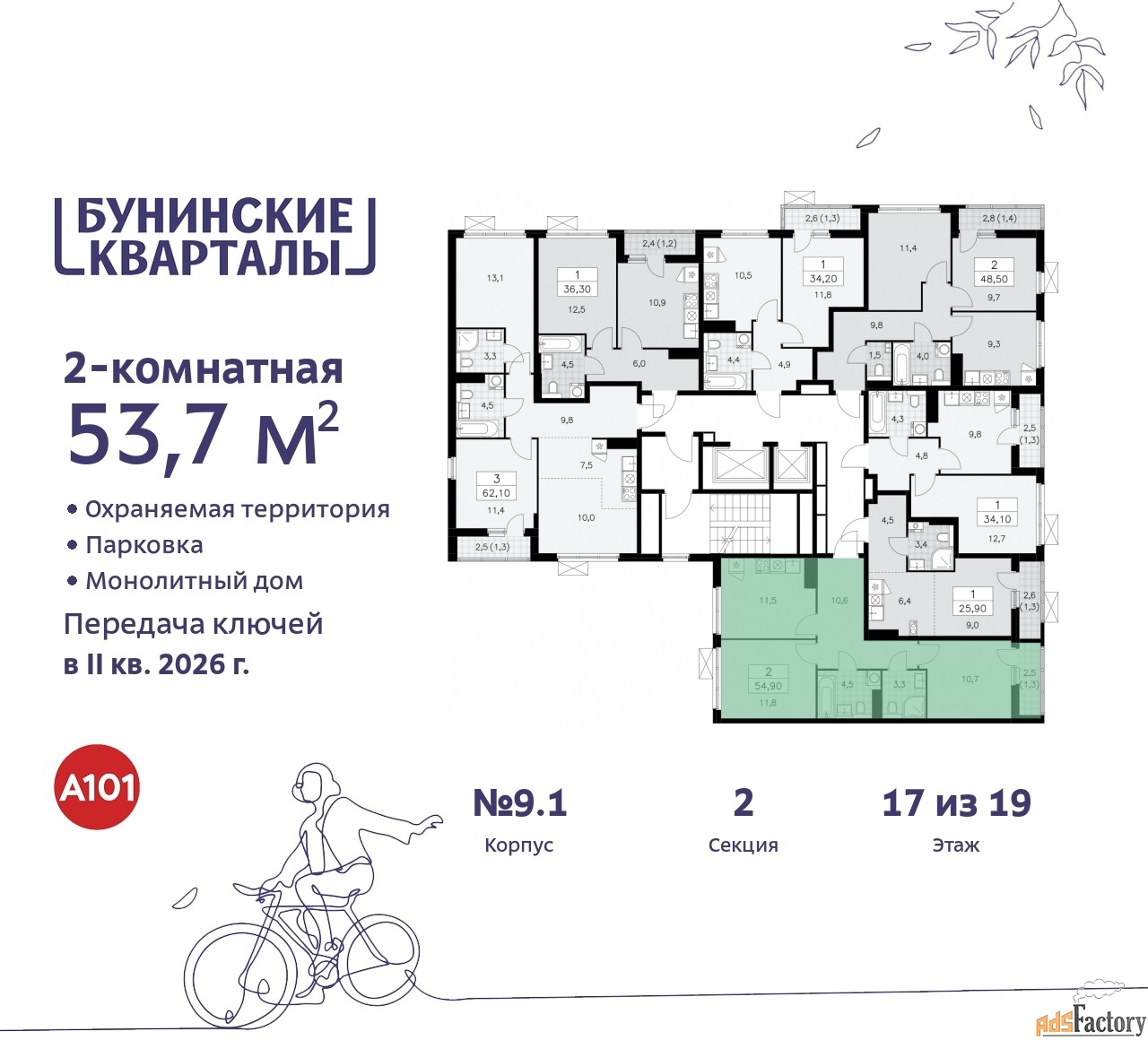 Дом монолитный, многоподъездный, переменной этажности, от 9 до 19 этажей. Квартира находится во 2-й секции высотой 17 этажей в корпусе 9.1. На этаже 7 квартир. В подъезде 1 пассажирский и 1 грузовой лифт. Начало строительства - 4 квартал 2023 года. Окончание строительства - 2 квартал 2026 года. Оформление сделки по договору долевого участия.
