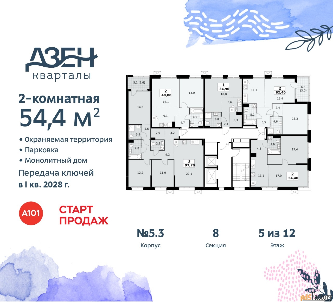 Дом монолитный, трехподъездный, переменной этажности, от 8 до 12 этажей. Квартира находится в 3-й секции высотой 12 этажей в корпусе бизнес-класса 5.3. На этаже 5 квартир. В подъезде 1 пассажирский и 1 грузовой лифт. Начало строительства - 3 квартал 2025 года. Окончание строительства - 1 квартал 2028 года. Оформление сделки по договору долевого участия.