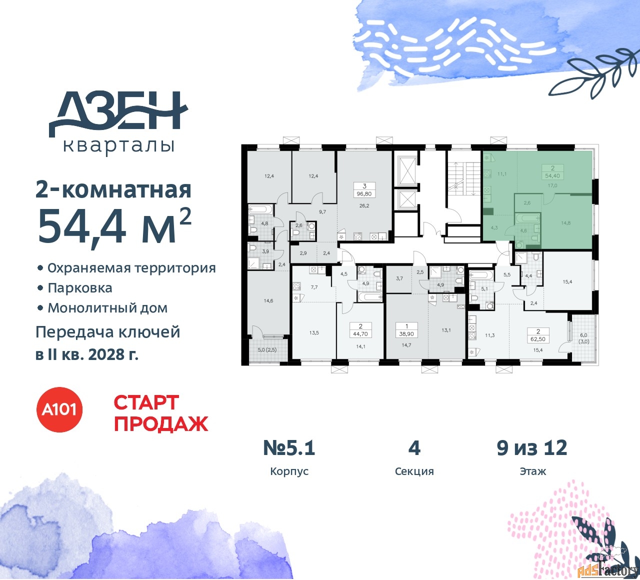 Дом монолитный, черырехподъездный, переменной этажности, от 8 до 12 этажей. Квартира находится в 4-й секции высотой 12 этажей в корпусе бизнес-класса 5.1. На этаже 5 квартир. В подъезде 1 пассажирский и 1 грузовой лифт. Начало строительства - 3 квартал 2025 года. Окончание строительства - 2 квартал 2028 года. Оформление сделки по договору долевого участия.