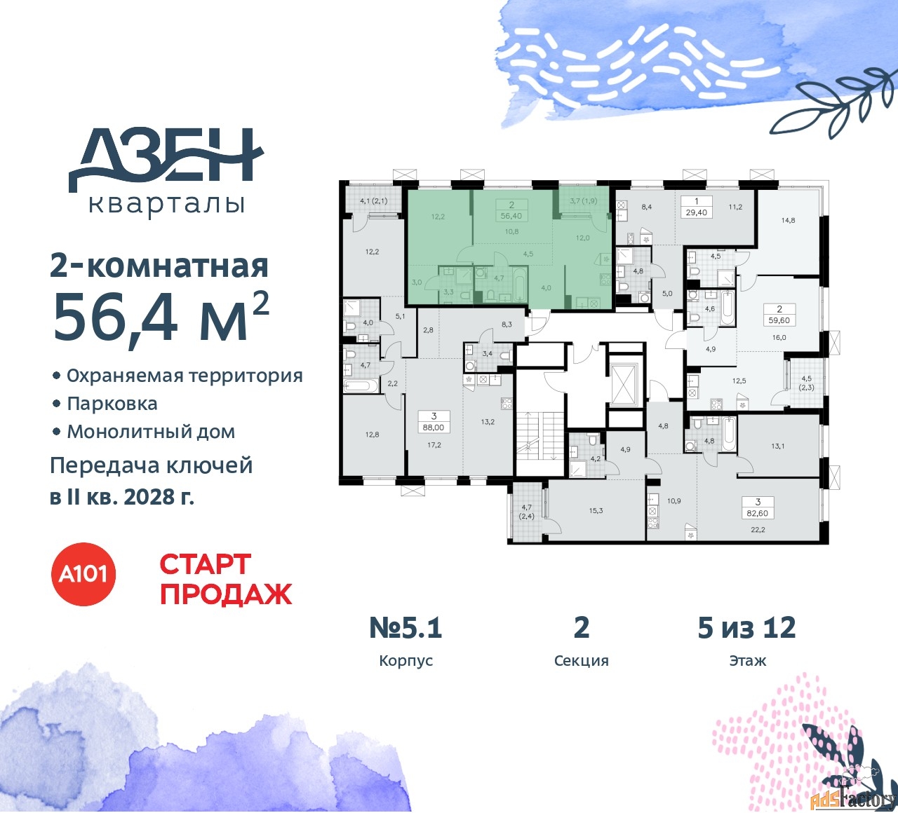 Дом монолитный, черырехподъездный, переменной этажности, от 8 до 12 этажей. Квартира находится во 2-й секции высотой 8 этажей в корпусе бизнес-класса 5.1. На этаже 5 квартир. В подъезде 1 грузовой лифт. Начало строительства - 3 квартал 2025 года. Окончание строительства - 2 квартал 2028 года. Оформление сделки по договору долевого участия.