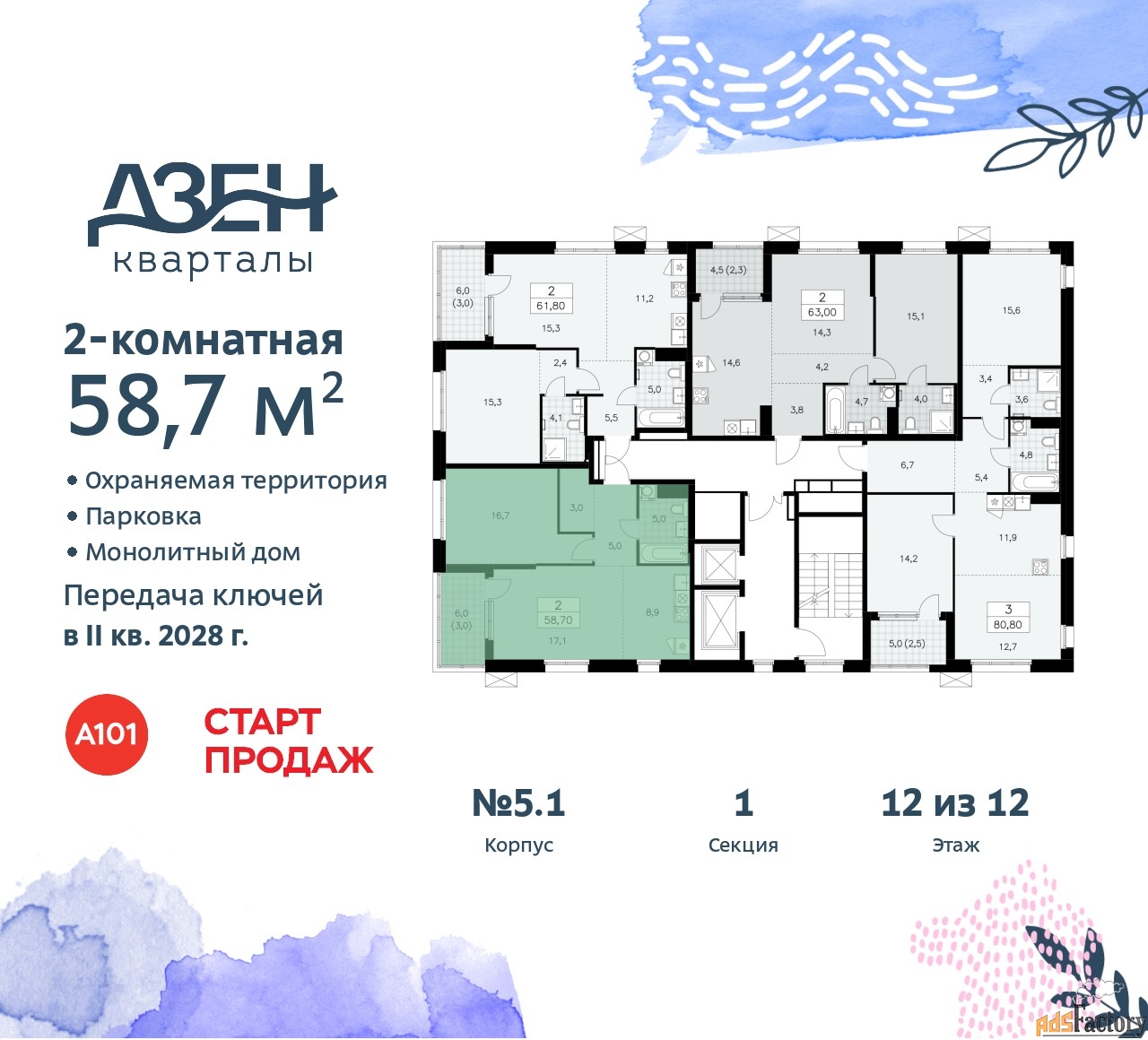 Дом монолитный, черырехподъездный, переменной этажности, от 8 до 12 этажей. Квартира находится в 1-й секции высотой 12 этажей в корпусе бизнес-класса 5.1. На этаже 4 квартиры. В подъезде 1 пассажирский и 1 грузовой лифт. Начало строительства - 3 квартал 2025 года. Окончание строительства - 2 квартал 2028 года. Оформление сделки по договору долевого участия.