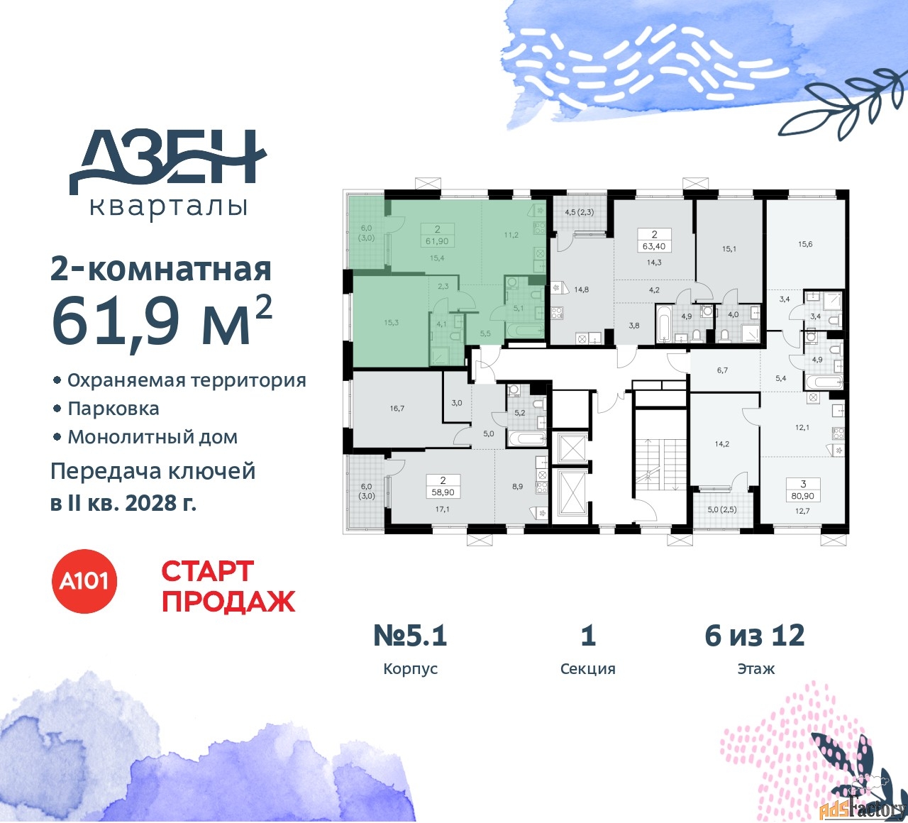 Дом монолитный, черырехподъездный, переменной этажности, от 8 до 12 этажей. Квартира находится в 1-й секции высотой 12 этажей в корпусе бизнес-класса 5.1. На этаже 4 квартиры. В подъезде 1 пассажирский и 1 грузовой лифт. Начало строительства - 3 квартал 2025 года. Окончание строительства - 2 квартал 2028 года. Оформление сделки по договору долевого участия.